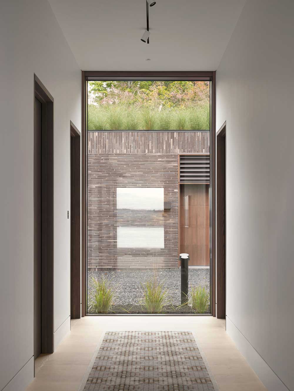 Orientata per catturare, attraverso ampie vetrate terra-cielo motorizzate, il paesaggio dei boschi e la vista dei tramonti che si riflettono sull’acqua, la villa è costruita con uno scheletro strutturale d’acciaio su fondazioni in cemento armato e tamponamenti in mattoni scuri d’argilla di provenienza danese. Le coperture sono in scandole di legno di cedro, più larghe del normale, prodotte da una segheria del posto.