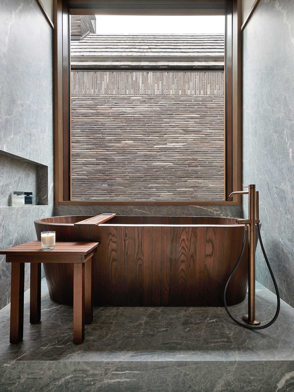 Il granito grigio e nero a spacco su cui poggia un piano di noce a spigoli vivi è lo stesso, di origine locale e risalente all’era cambriana, che si ritrova negli altri ambienti e nel giardino della villa.