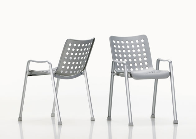 La seduta della sedia Landi, dotata di 91 fori che le conferiscono l’aspetto caratteristico e riducono di molto il suo peso, non segue solo il profilo della persona ma si sviluppa anche in direzione trasversale. Si crea così una seduta tridimensionale, il cui comfort aumenta ancora grazie alla flessibilità della lamiera in alluminio.
