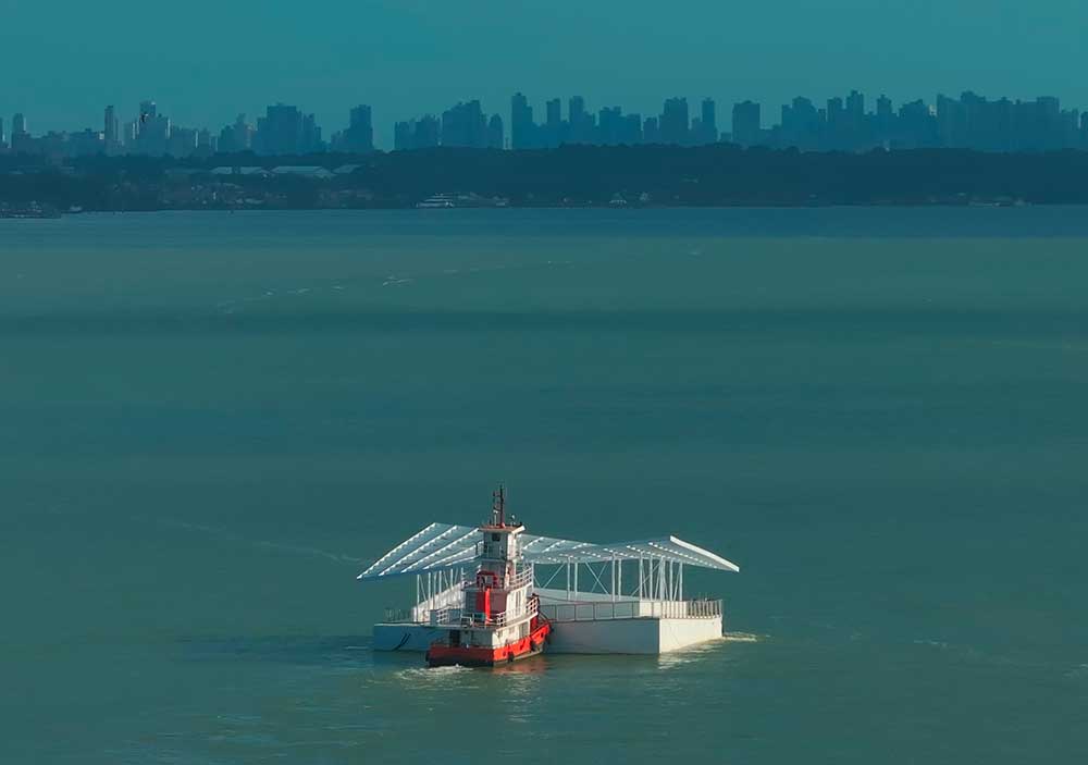A bordo della piattaforma di 400 metri quadrati gli effetti del cambiamento climatico – e in particolare l’innalzamento del livello dei mari, in un luogo come il delta amazzonico, che ogni giorno registra variazioni di marea fino a quattro metri di altezza – diventano un’esperienza personale e diretta perché il galleggiamento dell’installazione permette di osservare i sistemi naturali e quelli costruiti allo stesso livello dello sguardo.