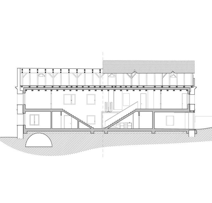 Nonostante gli anni e le rovine del tempo, il vecchio fabbricato, ridotto a un insieme di mattoni e una copertura a due falde, aveva mantenuto la sua imponenza e le qualità originarie. Il lavoro dei progettisti, durato un paio d’anni, è consistito nel ricostruire ciò che rimaneva dello stabile, mantenendo il guscio esterno e riorganizzando gli interni.