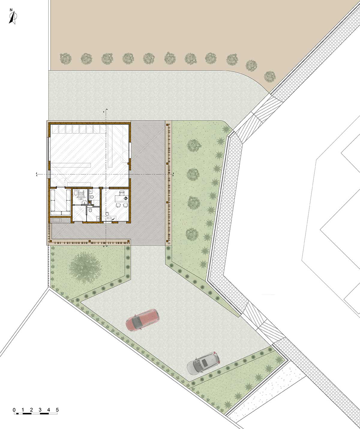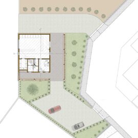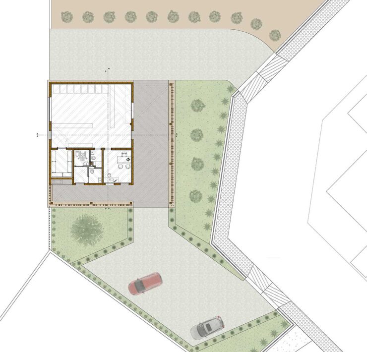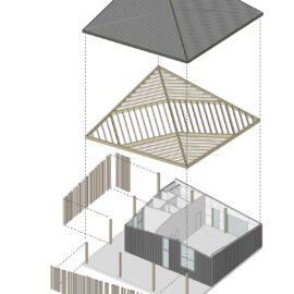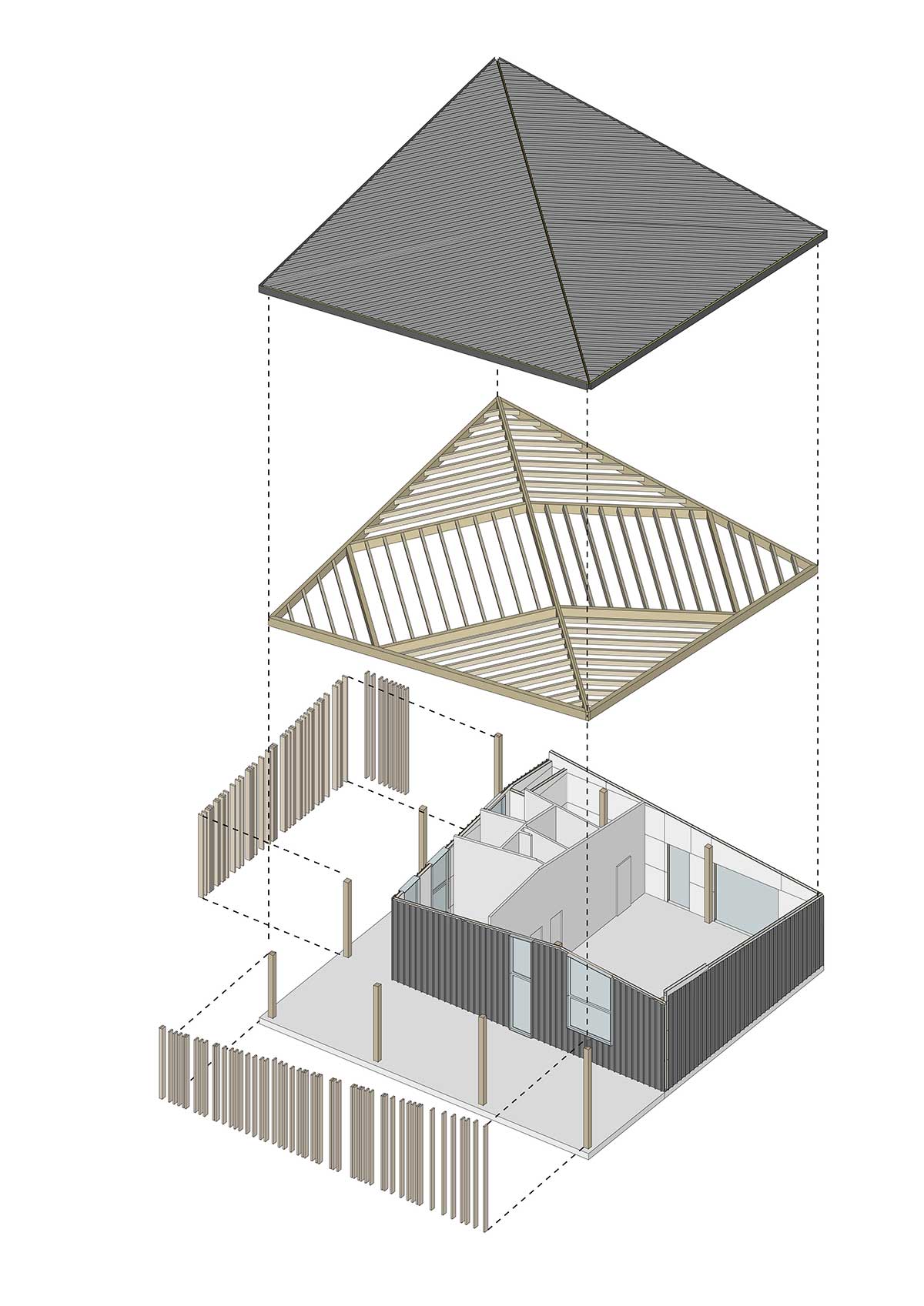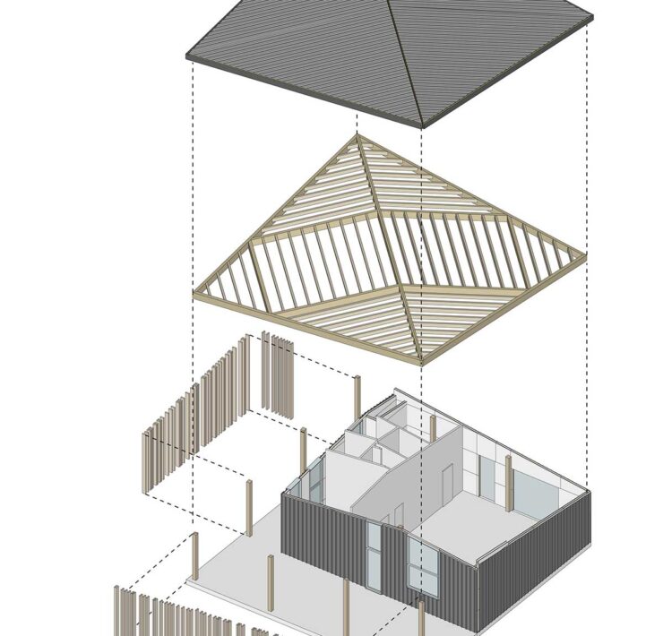 Il progetto è partito dall’idea di “casa come luogo di ospitalità”, giocando con l’immagine archetipica di un edificio simmetrico con tetto a due falde. Ruotando la linea di colmo e modificando la posizione delle travi principali e secondarie, la casa tradizionale si trasfigura in un edificio dinamico, pur mantenendo l’asse di simmetria e una semplicità costruttiva utile a ridurre costi e tempi di costruzione.