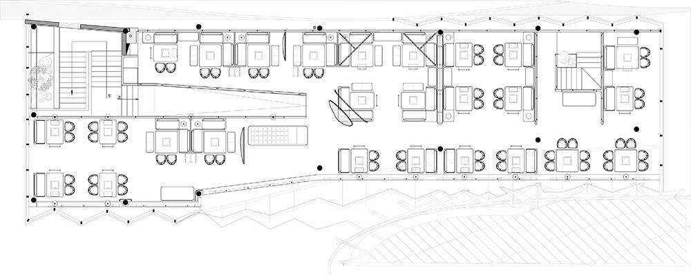 Il tetto inclinato della struttura originale su Jiaozi Avenue è stato mantenuto e ha dato origine al concept progettuale. Ispirata alle scene di vita nelle zone rurali del Sichuan, la struttura intrecciata dell’esterno richiama il paesaggio forestale della zona e gli strumenti tradizionalmente usati per la cottura a vapore.