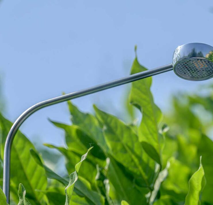 Molteplici le applicazioni: su stelo ad arco funziona per illuminare le siepi, i cespugli più bassi o quelli contenuti in fioriere, mimetizzandosi come un elemento naturale tra gli altri; oppure può diventare un elemento architettonico all’interno di un progetto di paesaggio.