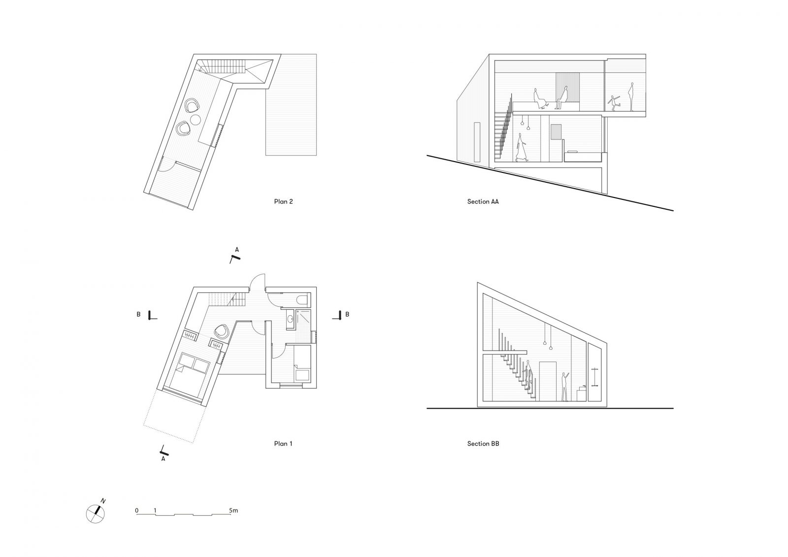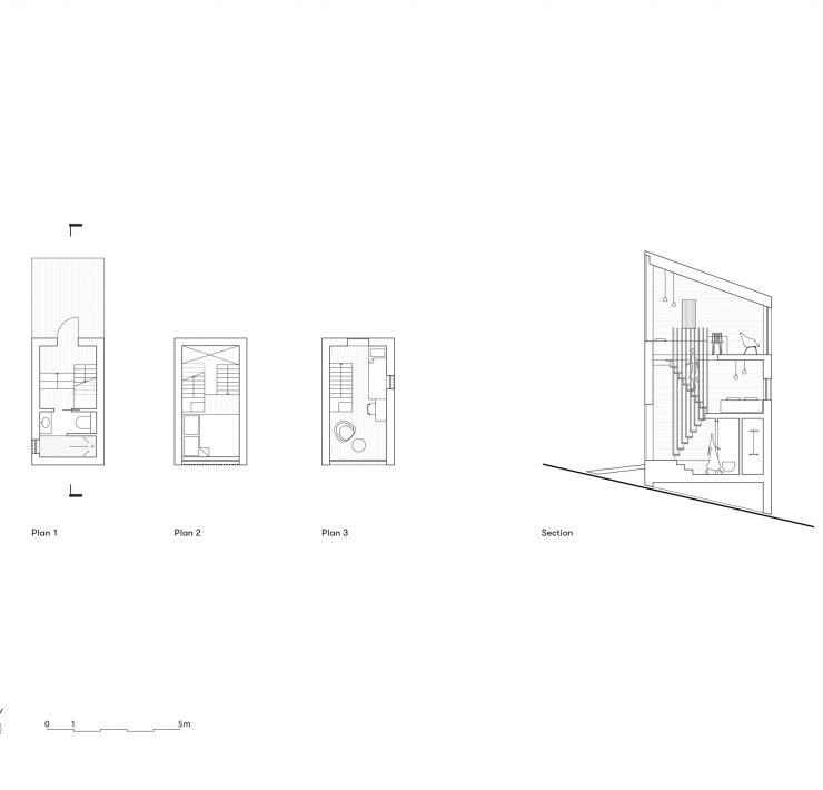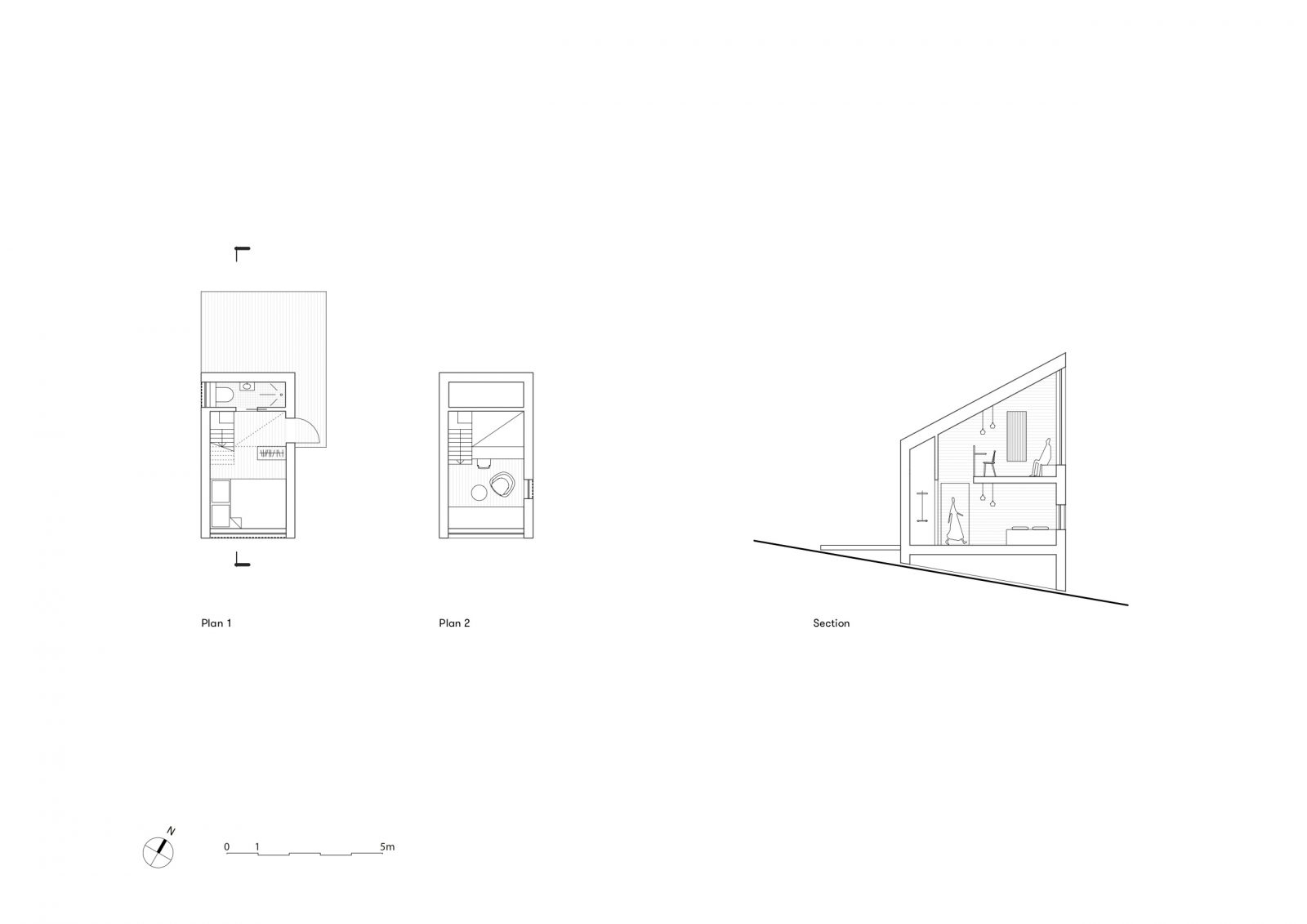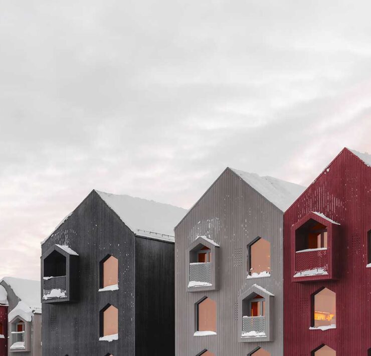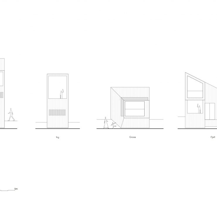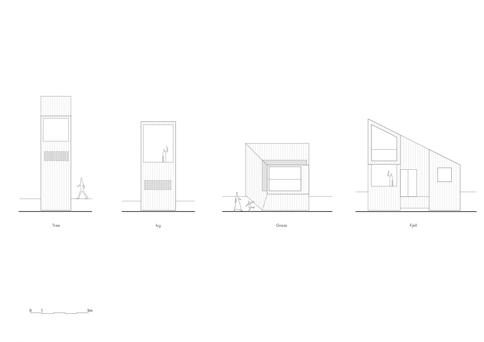 Le quattordici strutture, ognuna dai 18 ai 38 mq, sono state progettate in quattro diverse. Le hytte ‘Gress’ (‘Erba’) sono raggruppate vicino all’edificio principale. ‘Tre’ (‘Albero’) e ‘Eføy’ (‘Edera’), torreggianti e sottili, combinano verticalità e vista panoramica. Infine, le ‘Fjell’ (‘Montagne’) sono disposte in cima alla collina.