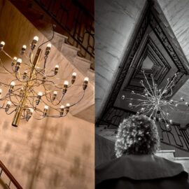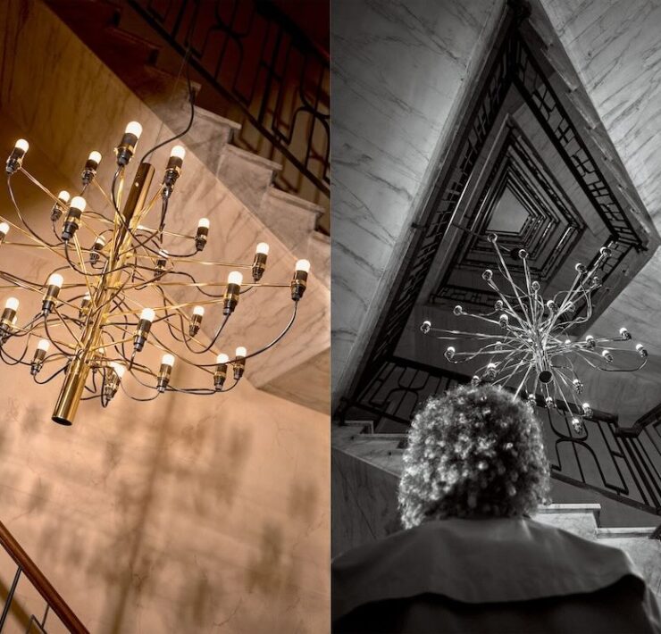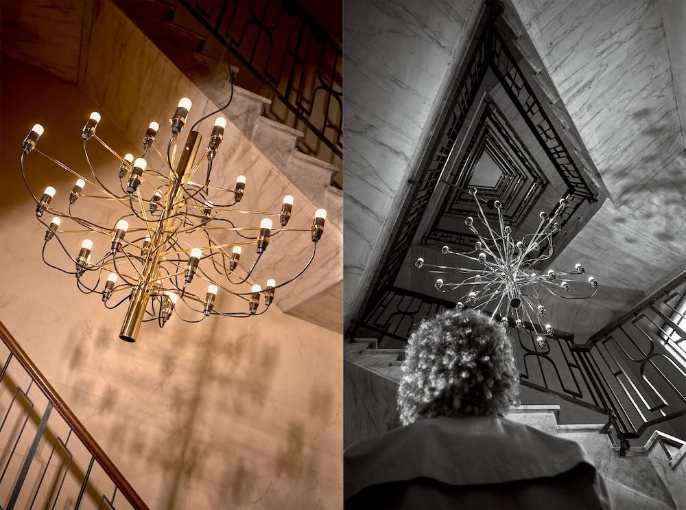 Le lampade sono ritratte come protagoniste centrali all’interno di eleganti palazzi storici milanesi. Dai materiali e dai dettagli di pavimenti, scale, pareti e soffitti degli interni si riconoscono nomi importanti dell’architettura italiana come Achille Luigi Ferraresi, Gio Ponti, Alberto Rosselli e Vito e Gustavo Latis.
