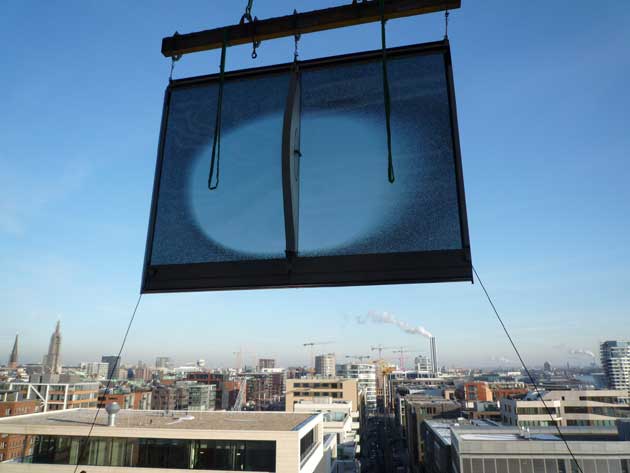 fase di montaggio di uno dei 1.100 pannelli in vetro della facciata (foto ©Yvonne Ehnert) |