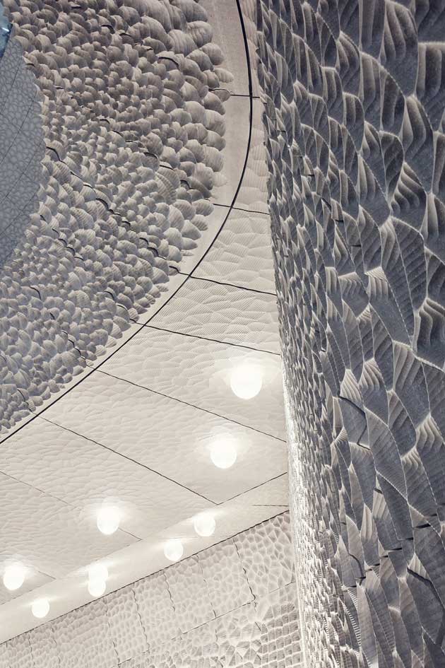 I 7.000 mq della copertura, formata da otto sezioni sferiche concave raccolte in una curvatura continua che ricorda le onde di un mare in tempesta, sono composti di elementi circolari riflettenti come gigantesche paillettes.