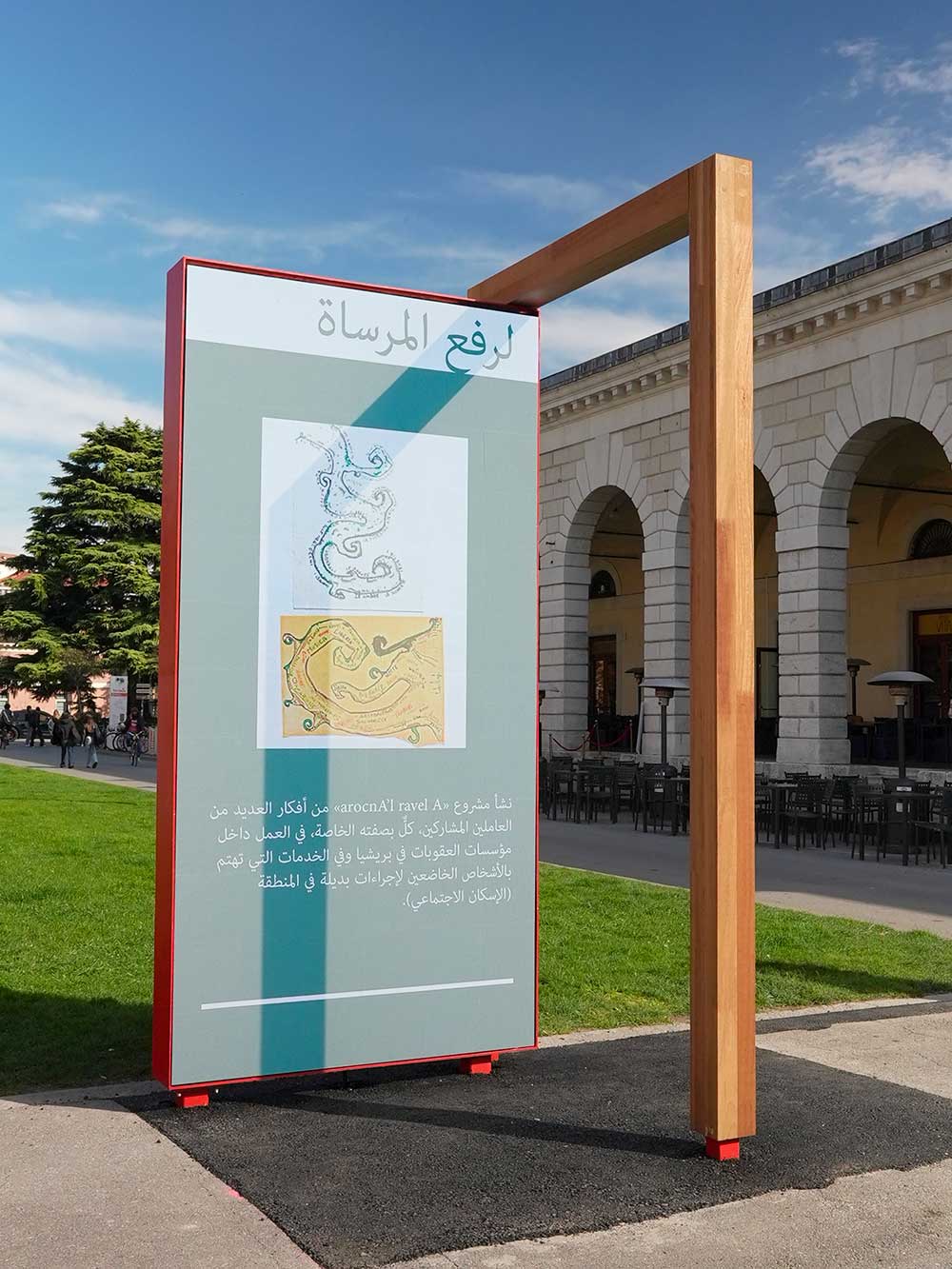 Formate da due ante in legno alte tre metri e larghe un metro e mezzo, attivano un doppio movimento – dalla città al carcere e dal carcere alla città – favorendo la circolazione di informazioni, opportunità e progetti oltre i confini istituzionali.