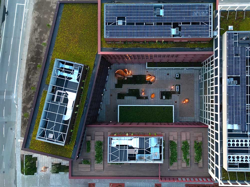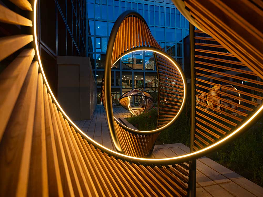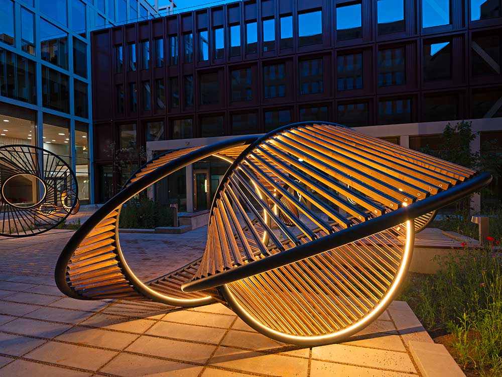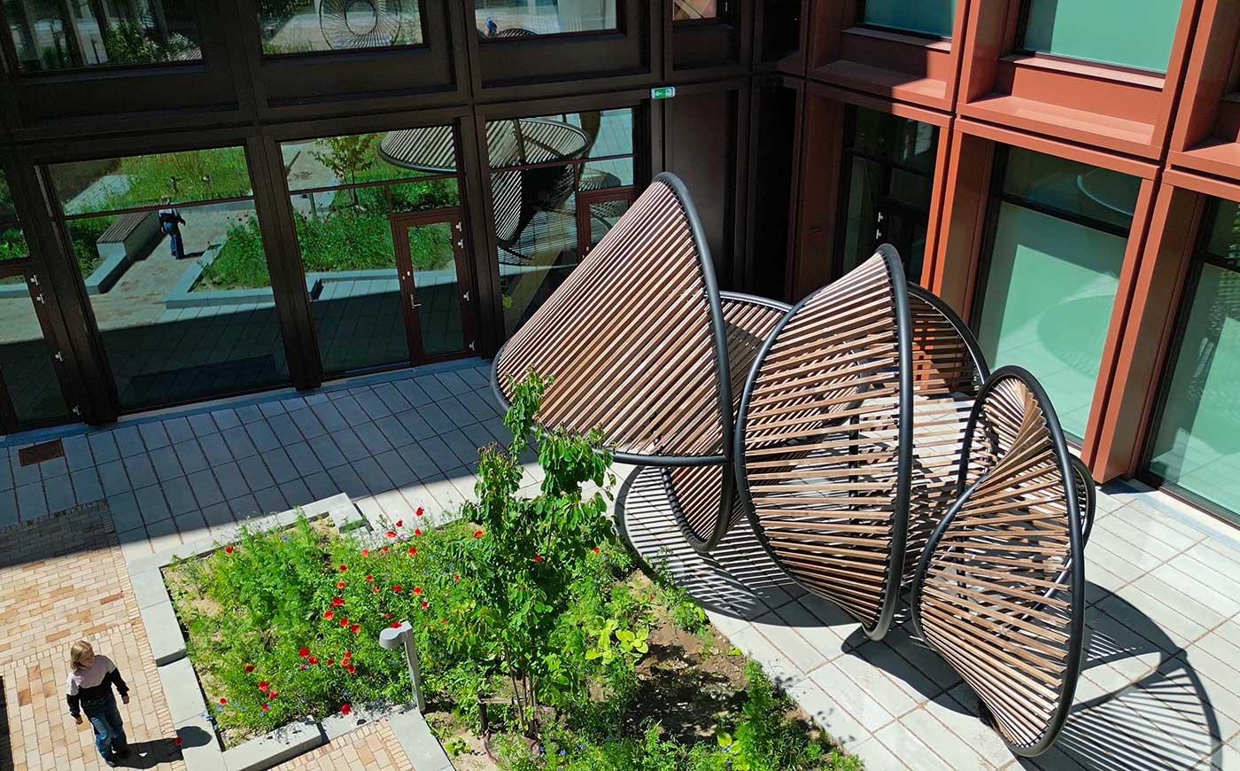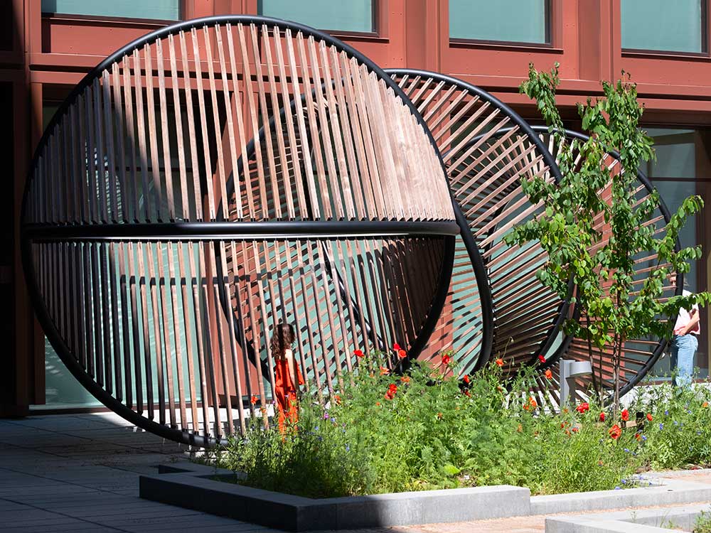 Per la corte attorno alla quale si sviluppano gli edifici l’artista Thilo Frank, già assistente dello studio Olafur Eliasson, e l’architetto Phillip C. Reiner (fondatore della piattaforma indipendente di ricerca in geometrie avanzate protoCtrl), hanno realizzato undici sculture interconnesse che creano soglie per il movimento e l’incontro.