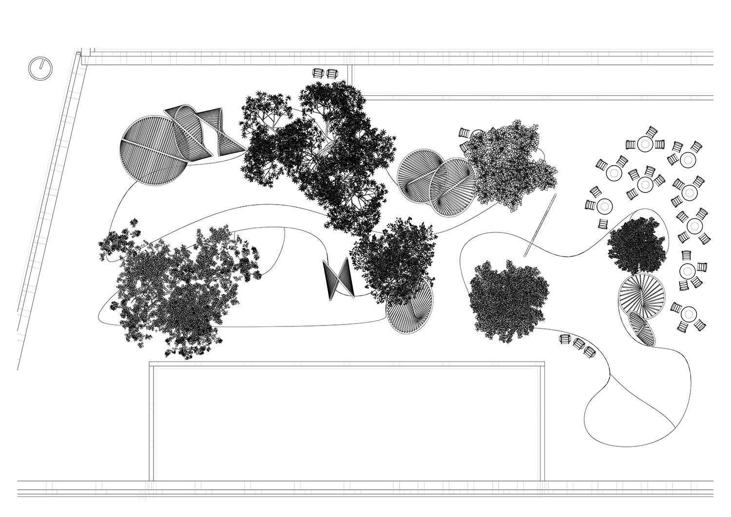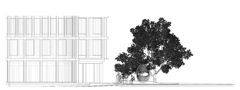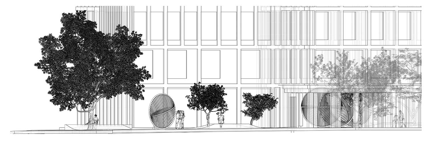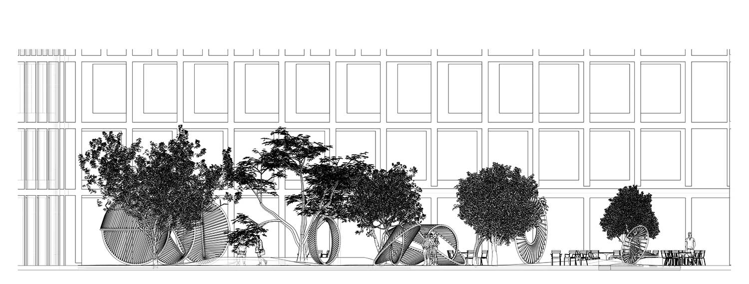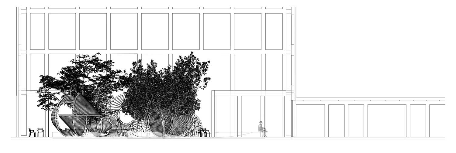 Per la corte attorno alla quale si sviluppano gli edifici l’artista Thilo Frank, già assistente dello studio Olafur Eliasson, e l’architetto Phillip C. Reiner (fondatore della piattaforma indipendente di ricerca in geometrie avanzate protoCtrl), hanno realizzato undici sculture interconnesse che creano soglie per il movimento e l’incontro.