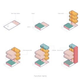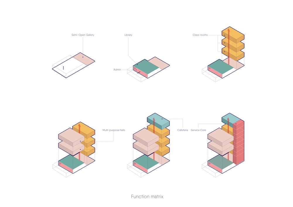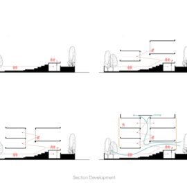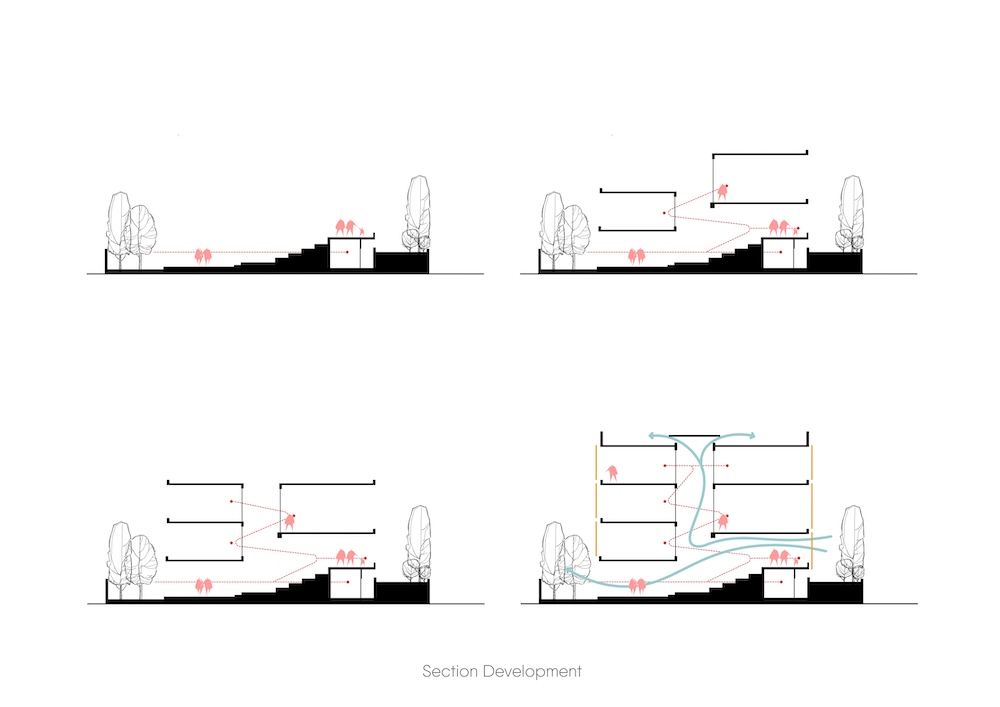 In sezione, l’architettura si apre verso sud, che è la principale direzione del vento a Chennai. Il lato sud del sito è sollevato a forma di giardino per sfruttare la brezza del sud, approfittando anche di un canale del vento generato dalla strada estesa oltre il sito.