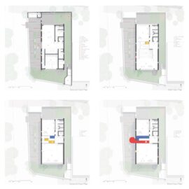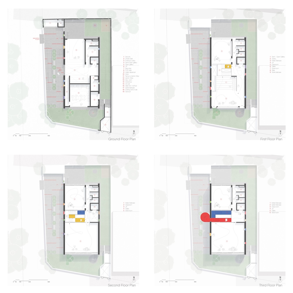 Si può accedere al giardino tramite uno scivolo che parte dalla biblioteca. Cinque aule sono disposte su entrambi i lati dell’atrio centrale. All’interno di questo atrio, una scala metallica si snoda verso l’alto, collegando tutti i livelli.