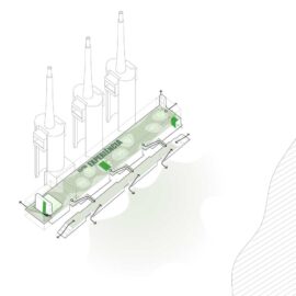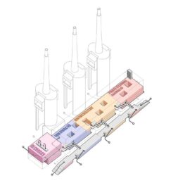 I tagli definiscono i tre corpi equivalenti e autonomi nei quali si articola l’intero spazio costruito, corrispondenti ciascuno a una delle entità funzionali del futuro Catalunya Media City e ai quali si aggiunge il segmento del nuovo volume, edificato a prolungare uno dei lati così che le tre ciminiere appariranno centrate e simmetriche rispetto ai volumi che fungono da basamento.