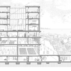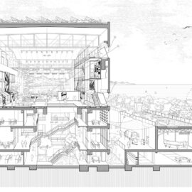 Con il titolo di felliniana memoria ‘E la nave va’, il progetto lascia intatto l’esistente, cui aggiunge un nuovo volume in legno e vetro su quattro livelli la cui ‘pelle’ tecnologica è capace di proiettare luce, suoni e immagini, e affronta lo spazio esterno stabilendo, con quattro tagli trasversali che attraversano il grande edificio, nuovi collegamenti naturalistici tra la città e il mare.