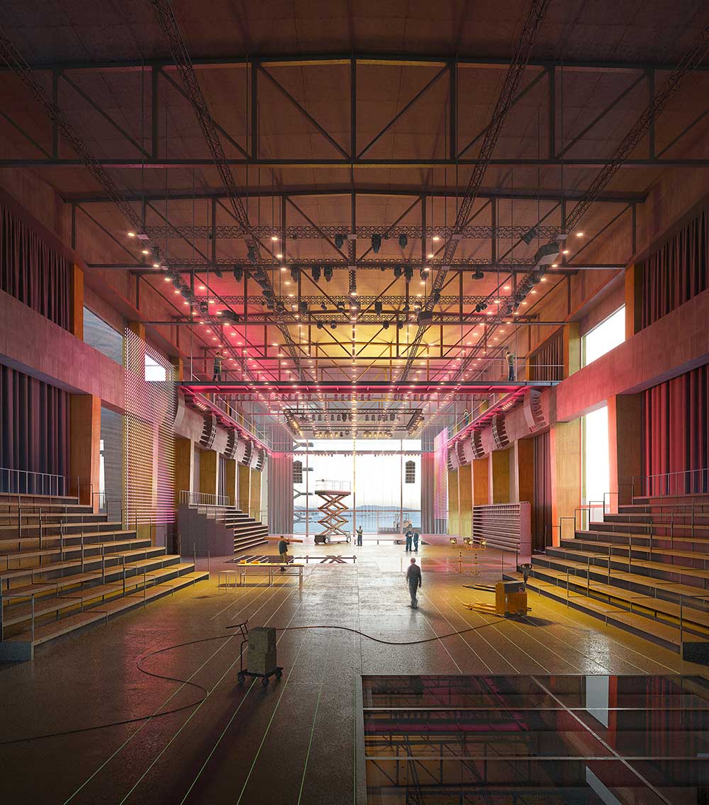 Nel caso specifico, l’altezza è di 17 metri e la lunghezza di 160. Il progetto valorizza il carattere vuoto di questo magnifico spazio, attrezzando in modo integrale solo il soffitto e il pavimento, permettendo di ospitare in questo spazio flessibile qualsiasi attività, da performance intime a installazioni su larga scala con capacità fino a 4.500 persone».
