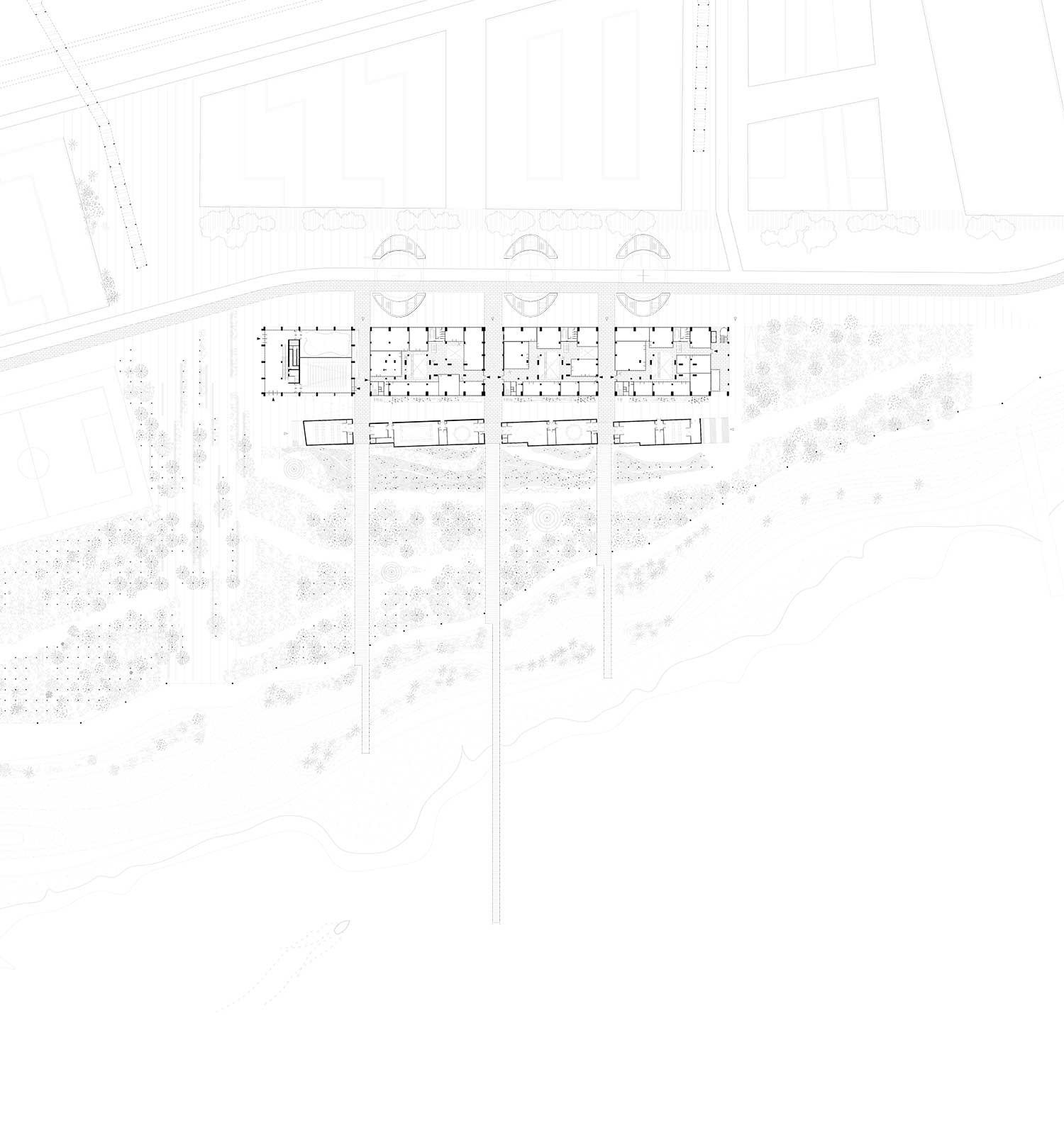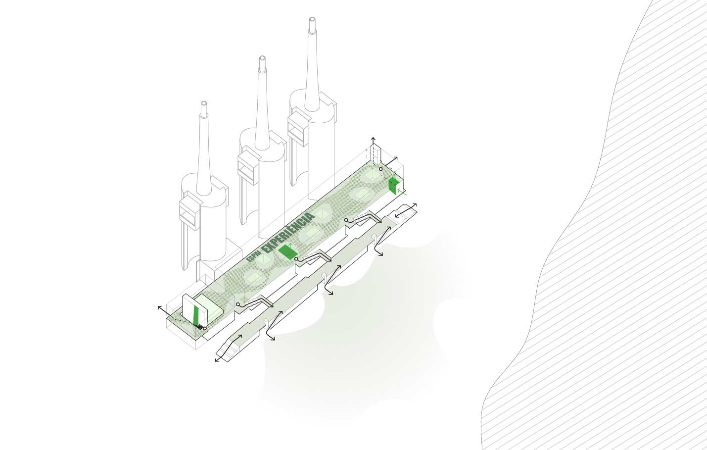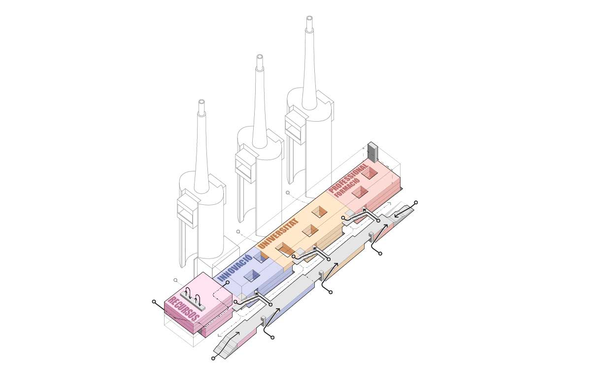 I tagli definiscono i tre corpi equivalenti e autonomi nei quali si articola l’intero spazio costruito, corrispondenti ciascuno a una delle entità funzionali del futuro Catalunya Media City e ai quali si aggiunge il segmento del nuovo volume, edificato a prolungare uno dei lati così che le tre ciminiere appariranno centrate e simmetriche rispetto ai volumi che fungono da basamento.