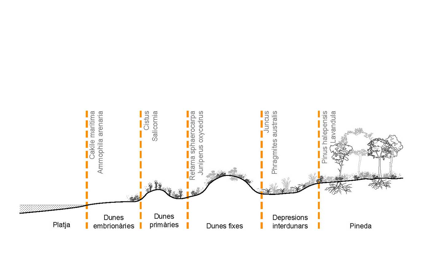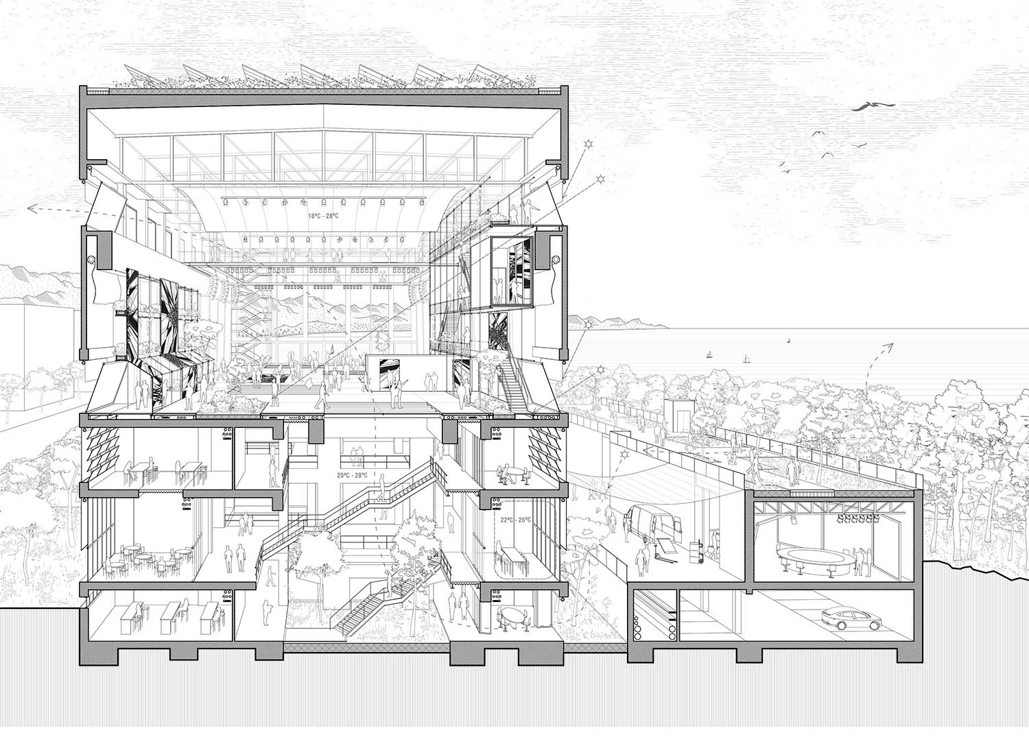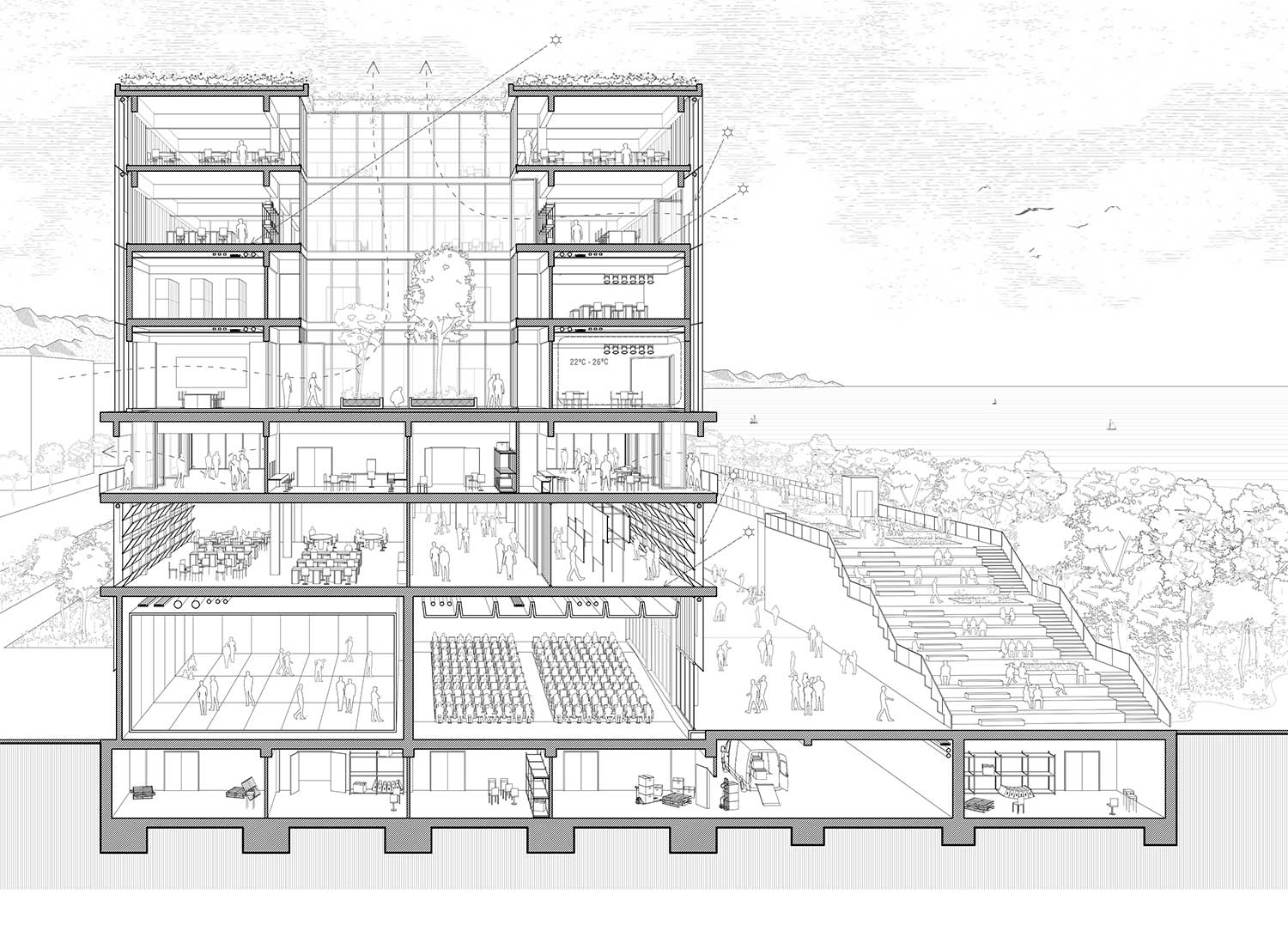 Attraverso i vuoti dell’edificato si insinuerà la vegetazione, fino a colonizzare e vivificare gli spazi interni. Scale leggere si svilupperanno sulla facciata rivolta al mare, fungendo da ponte tra l’interno della sala e la passeggiata longitudinale che copre una nuova duna artificiale che potrà essere impiegata per i set cinematografici: un elemento, a metà tra architettura e paesaggio, che insieme alla strada logistica che lo delimita segna anche nuove quote (la nuova quota d’accesso sarà a 6,55 m (attuale primo piano delle navate) e a 5,00 m l’accesso principale) per affrontare il possibile innalzamento del livello del mare e le mareggiate.