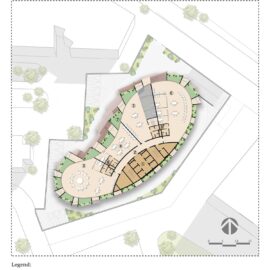 Il nucleo di circolazione verticale è previsto sul lato sud per mitigare l’apporto di calore e contemporaneamente chiudersi verso gli edifici residenziali esistenti su quel lato.