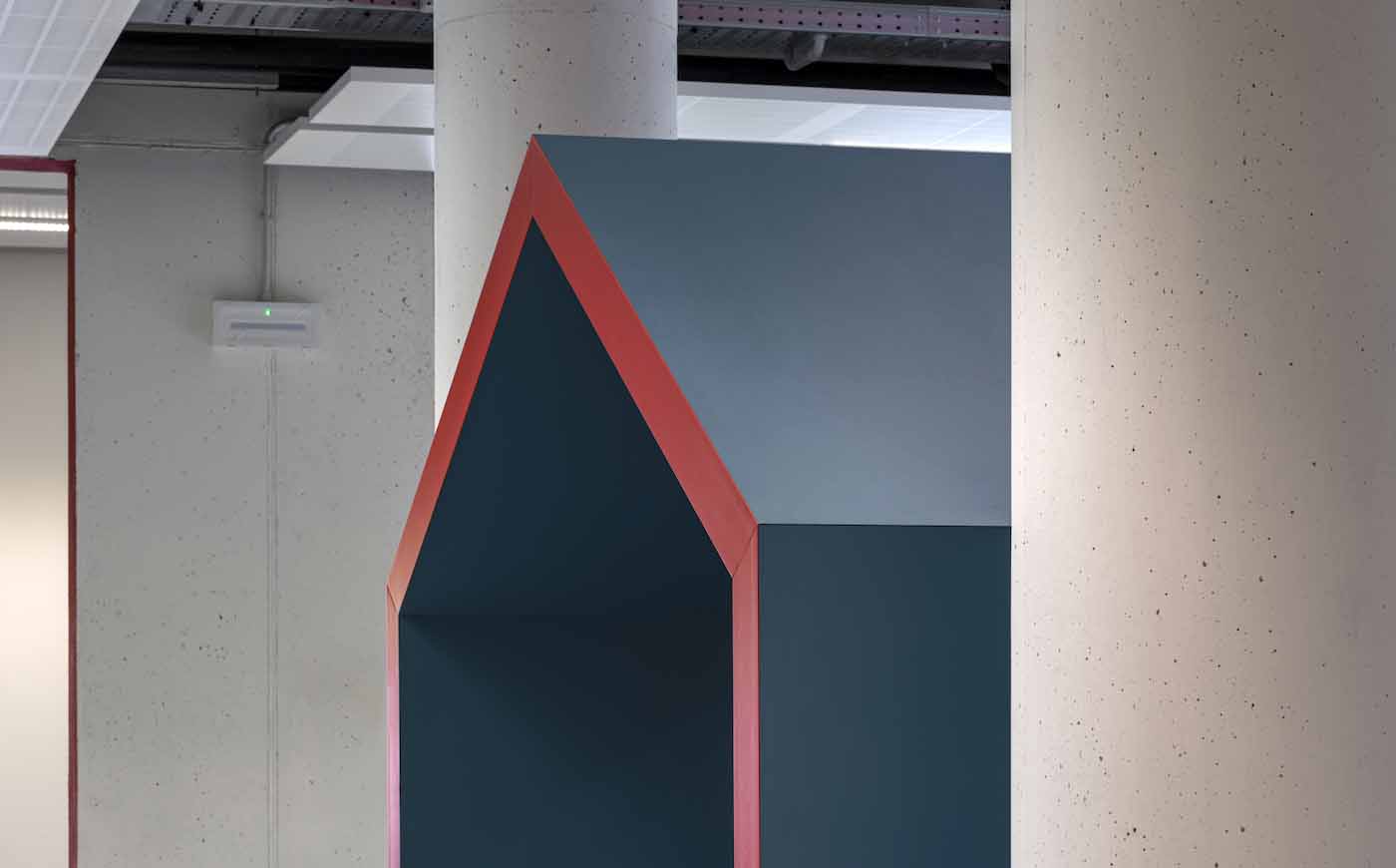 Colorate sagome di case in legno e laminato movimentano lo spazio e diventano funzionali nicchie per concentrarsi.