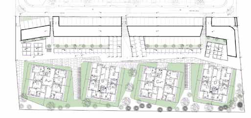 Prospetti nord, sul lato parcheggi cantine che costituiscono due volumi separati, antistanti le palazzine. I coronamenti riprendono il profilo delle Prealpi
