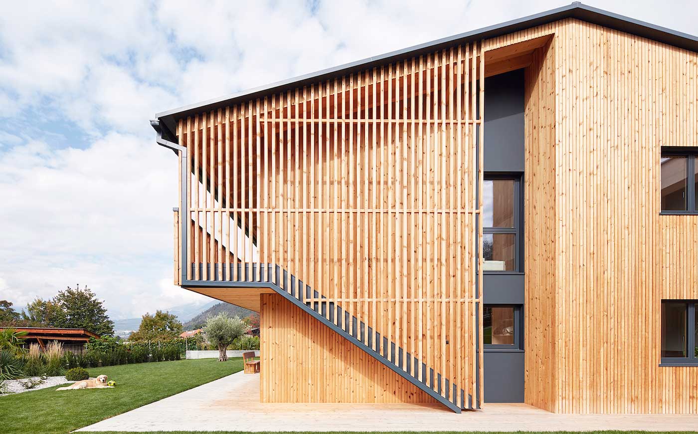 A Vezzano, un piccolo borgo di 400 abitanti alle pendici del monte Sole in Val Venosta, in Alto Adige, holzius ha realizzato in sole 9 settimane una casa plurifamiliare in legno massello lasciato al naturale: un vero e proprio organismo abitativo privo di colle e parti metalliche ed energeticamente autonomo.