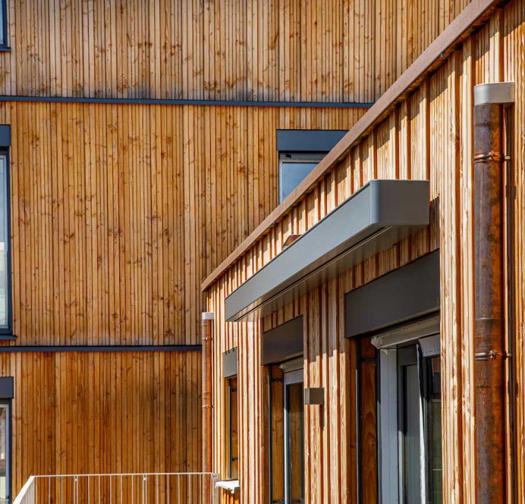 La squadra di montaggio ha poi lavorato al guscio della casa ricoprendolo completamente in legno massello non trattato. In particolare, le pareti esterne in legno massiccio, costituite da 3 strati (da 180 mm) con isolamento in fibra di legno, si alternano a sezioni rivestite di intonaco grigio scuro, mentre quelle all’interno sono rivestite da intonaco di argilla, che fornisce ulteriore calore e sicurezza.
