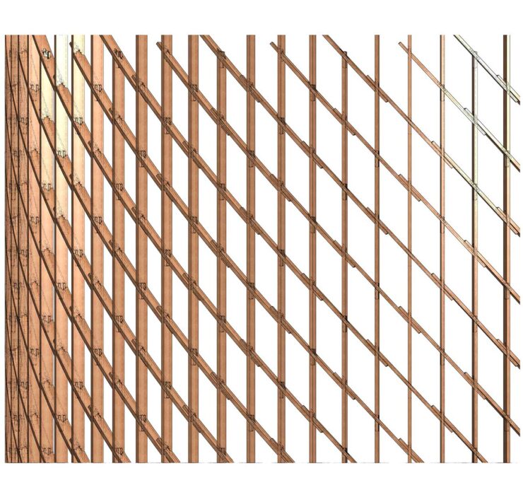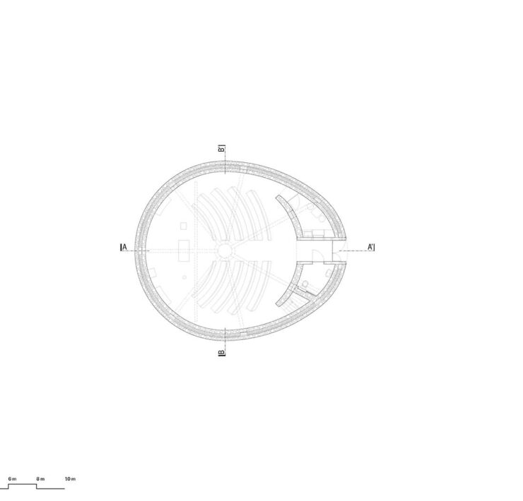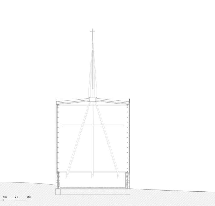 L’involucro esterno è composto da lame di legno verticali fissate a una struttura portante, anch’essa in legno tagliato a progetto con macchine a controllo numerico. Piccole finestre verticali lasciano filtrare la luce all’interno, sul pavimento e l’altare fatti di terra battuta. Tutti gli arredi sono stati realizzati su disegno dello studio.