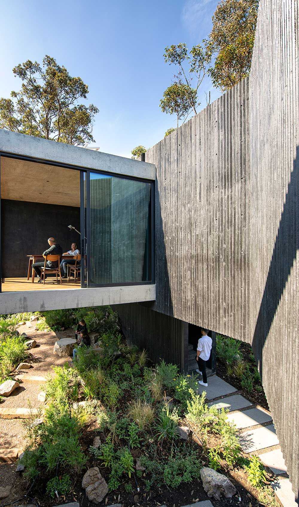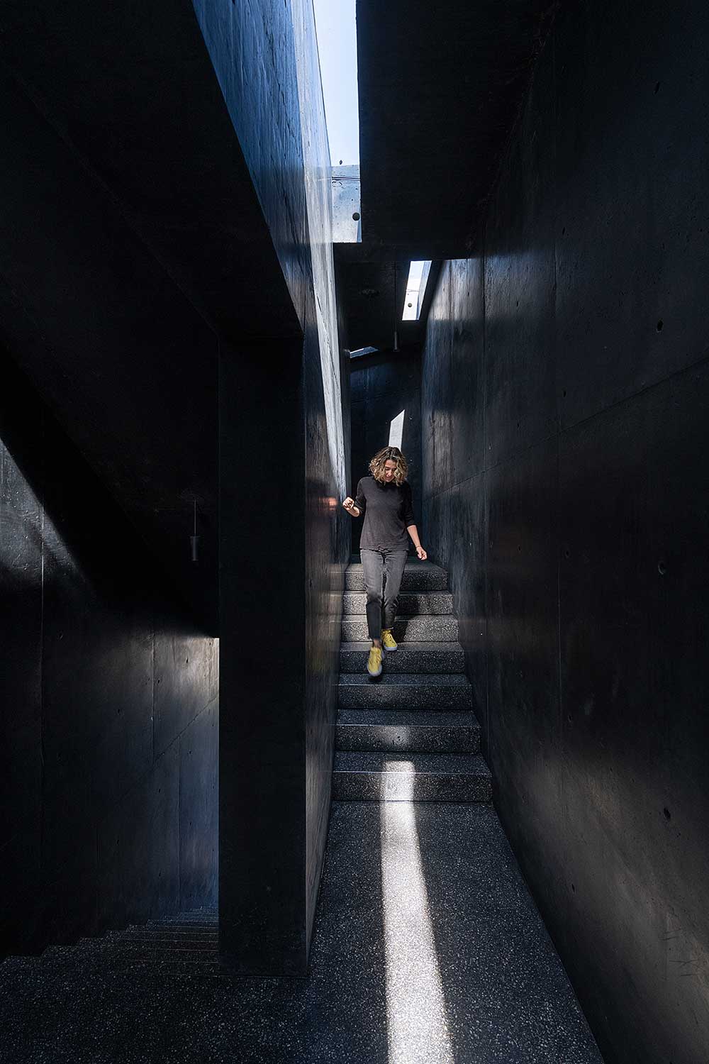 La pianta degli ambienti prende avvio dai percorsi distributivi, che in orizzontale formano sinuosi corridoi semi-bui in cemento a vista in sorprendente contrasto con la luminosità degli ambienti che si aprono sul patio vegetale interno creato dal percorso. Un patio sul quale quasi galleggiano gli ambienti più privati posti al livello superiore.