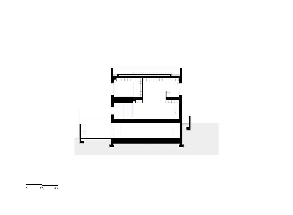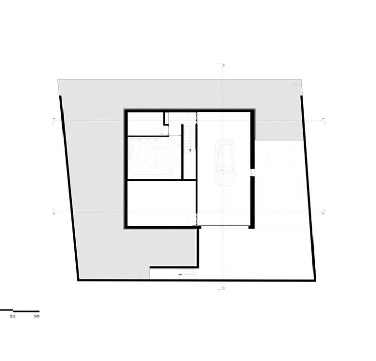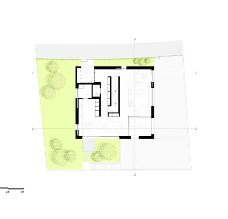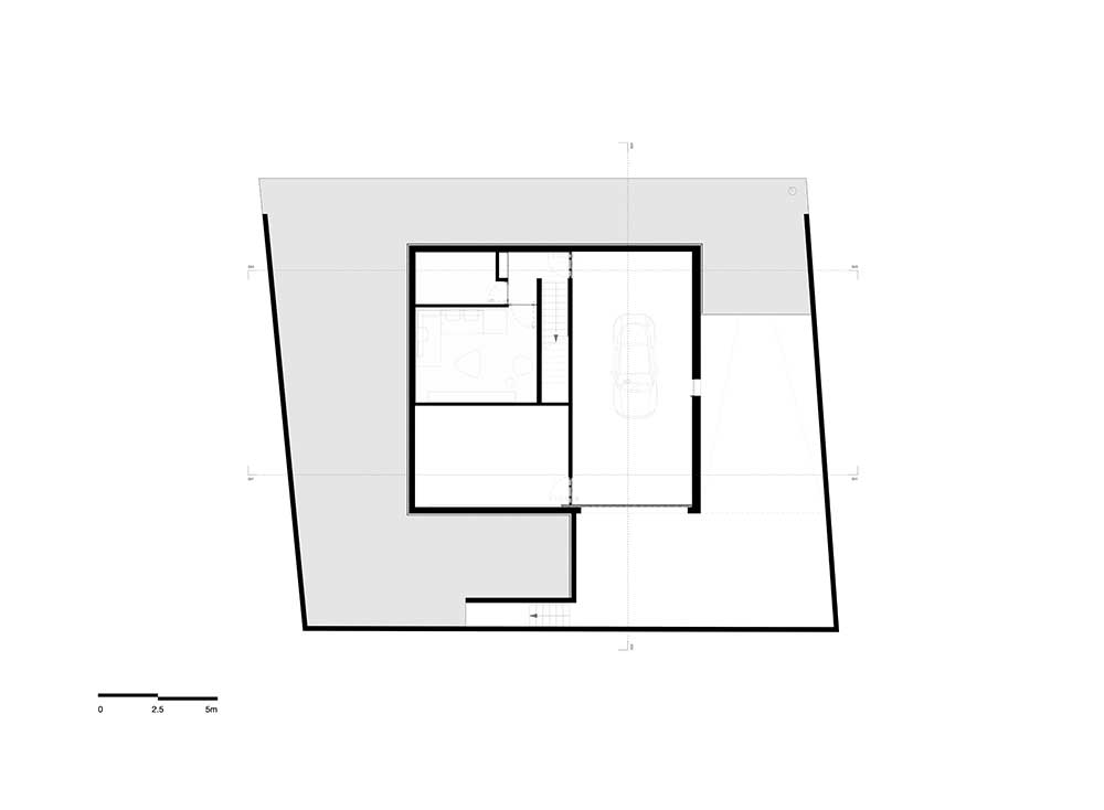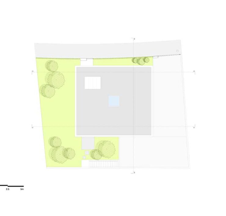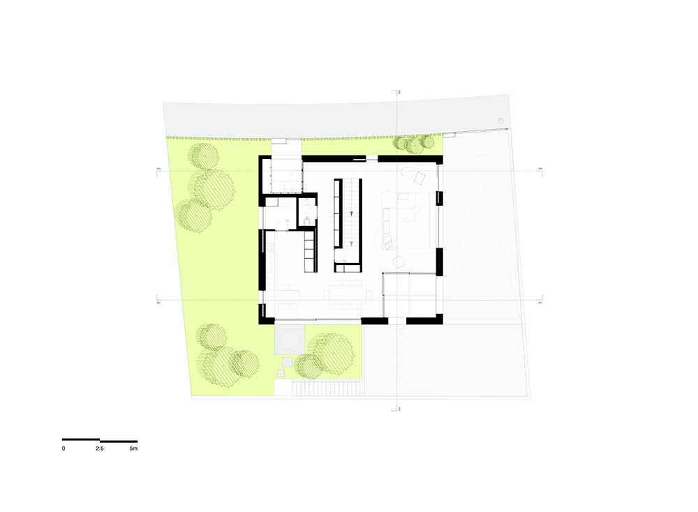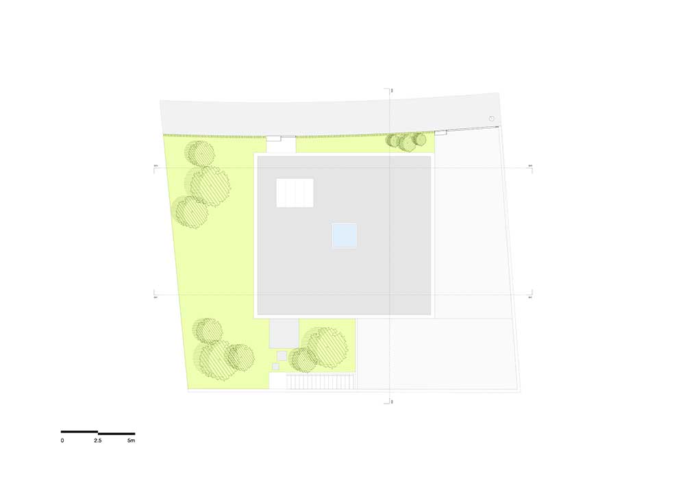 Costruita su un piccolo lotto di terreno in precedenza occupato dall’abitazione dei nonni del proprietario, casa SV si materializza nell’intorno come un rigoroso blocco di calcestruzzo, in parte a vista anche negli ambienti interni, e con un tetto piano sul quale si apre un lucernario che aggiunge luce ai già luminosi interni.