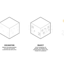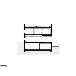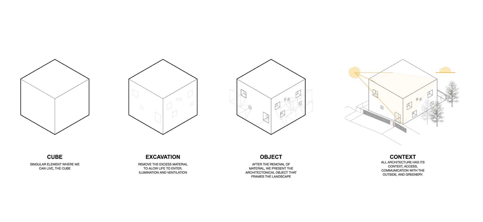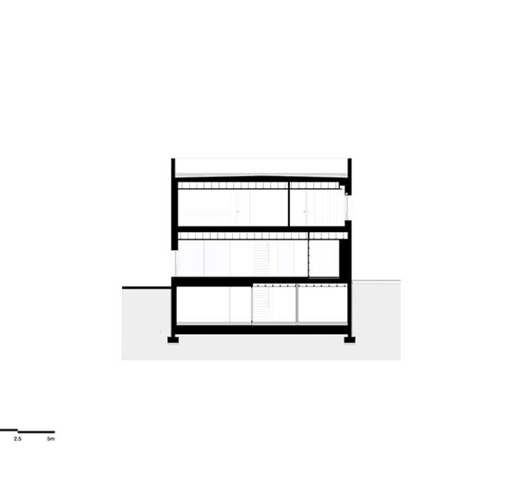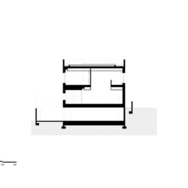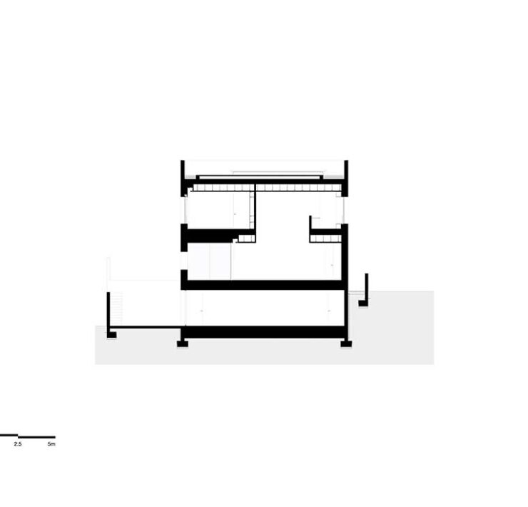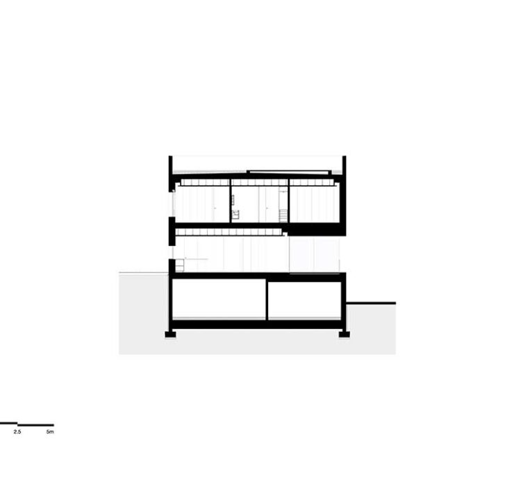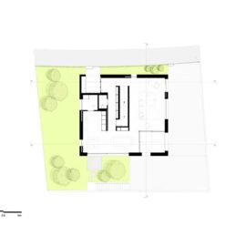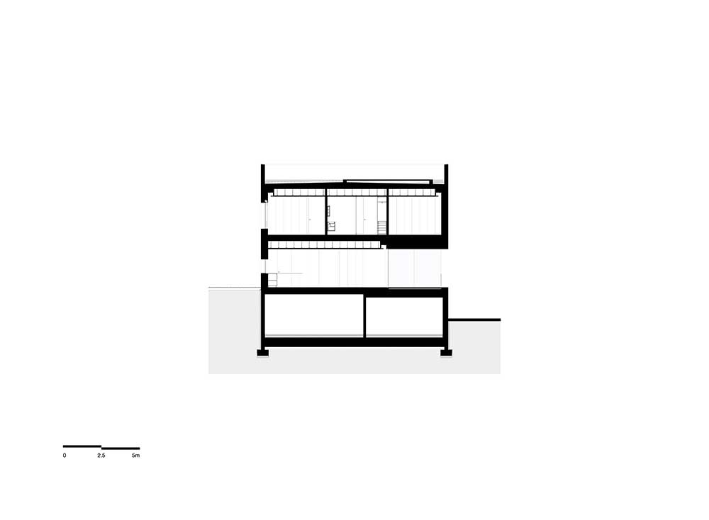 Costruita su un piccolo lotto di terreno in precedenza occupato dall’abitazione dei nonni del proprietario, casa SV si materializza nell’intorno come un rigoroso blocco di calcestruzzo, in parte a vista anche negli ambienti interni, e con un tetto piano sul quale si apre un lucernario che aggiunge luce ai già luminosi interni.