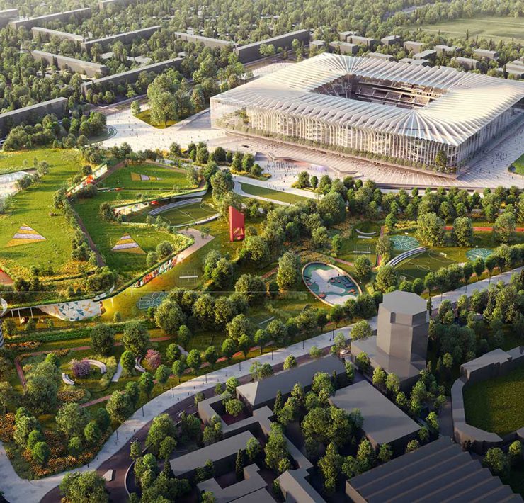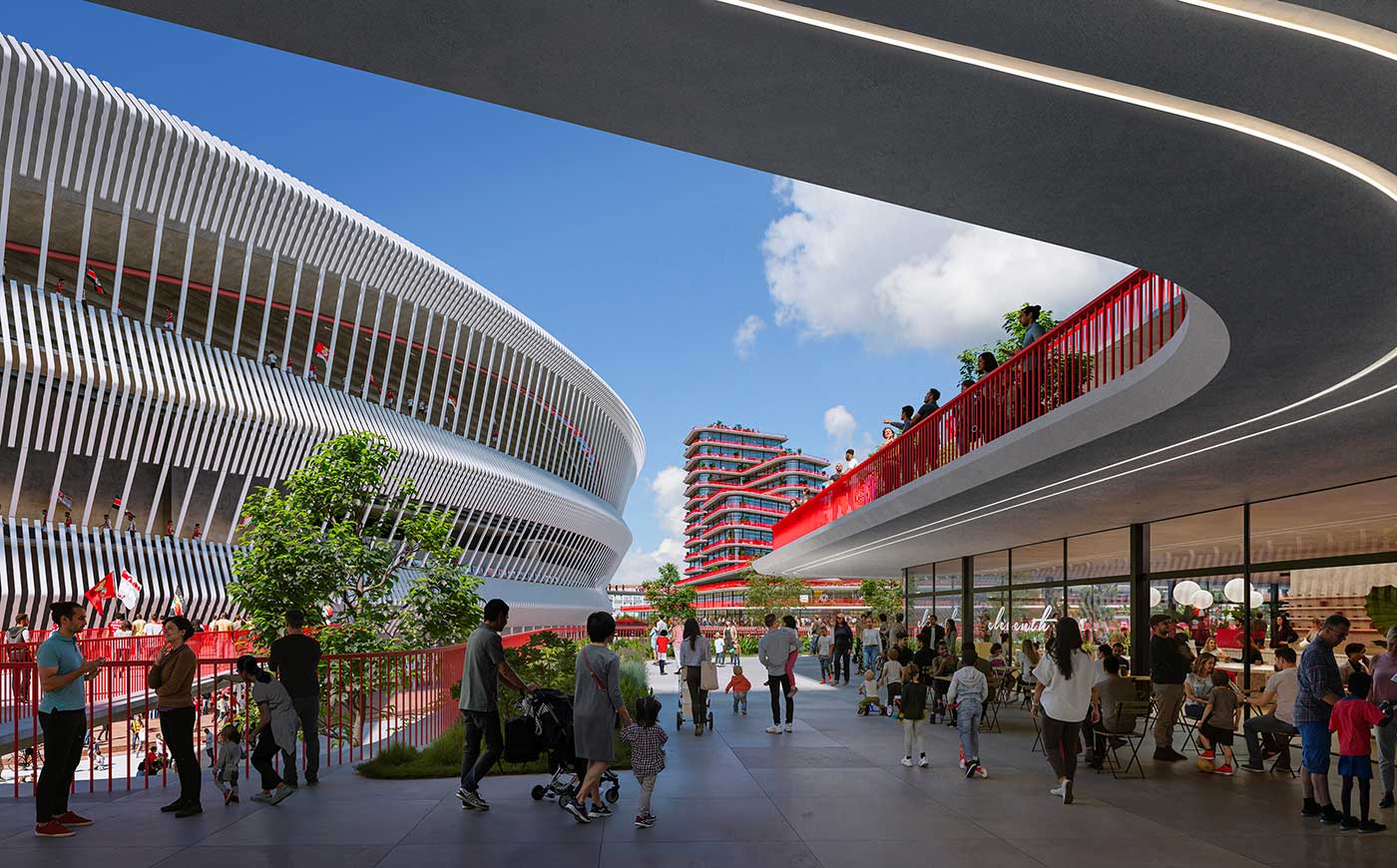 In termini di spazio pubblico, il masterplan prevede una nuova piazza di 4.000 metri quadrati situata di fronte alla facciata principale dello stadio.