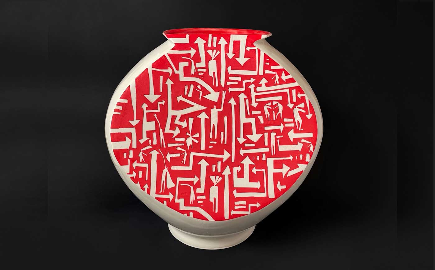 La delicata compostezza delle due moon jar bianche viene rotta da due tagli verticali che aprono chirurgucamente la superficie concava, rivelando con forza l’emergere dei pattern sui toni del rosso e del bianco. Il colore caldo e acceso restituisce la vitalità di scenari abitati che brulicano di storie e persone.