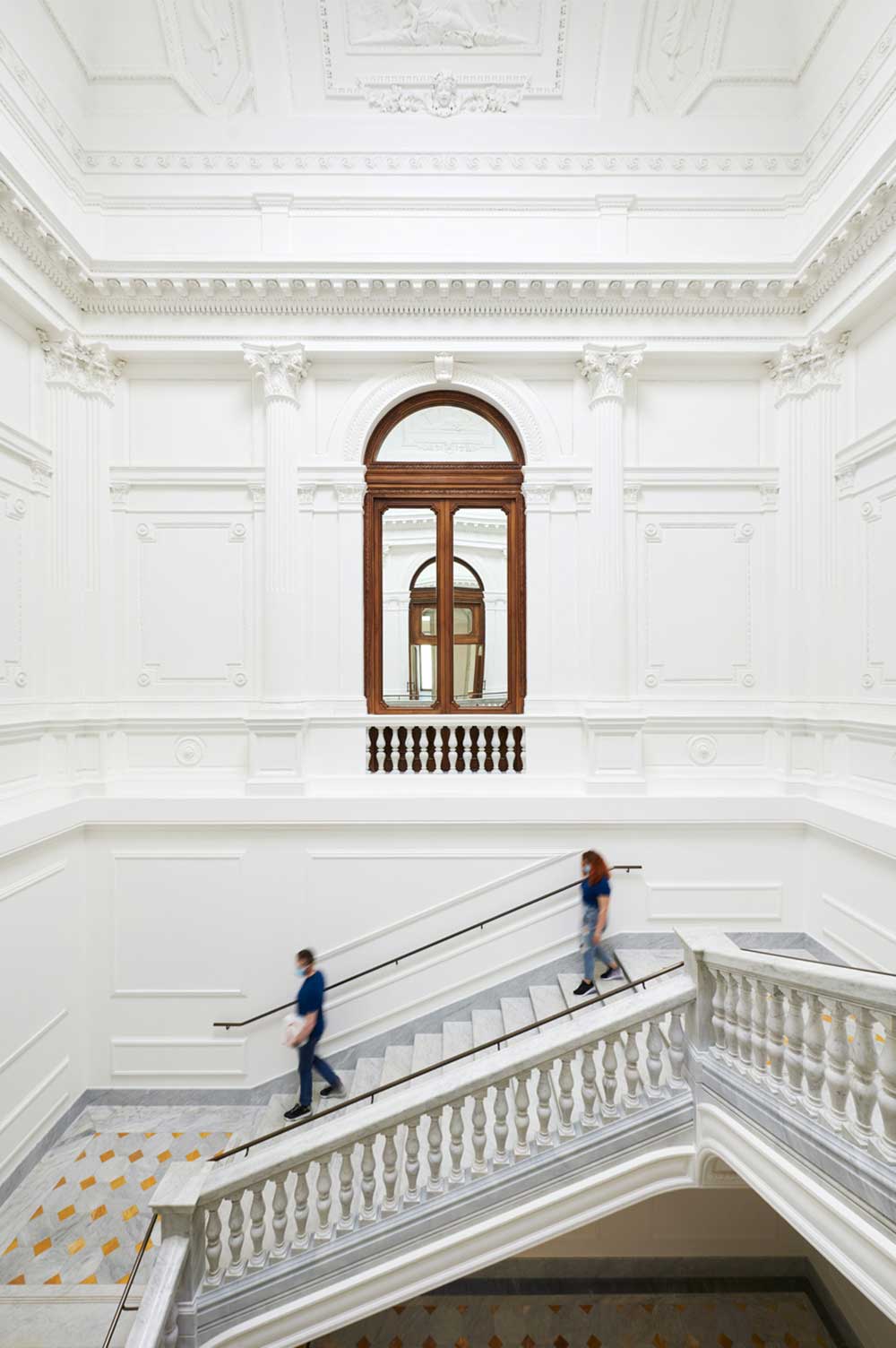 All’interno, una scala monumentale risalente al 1888, restaurata nei suoi dettagli originali in marmo di Carrara di provenienza locale.