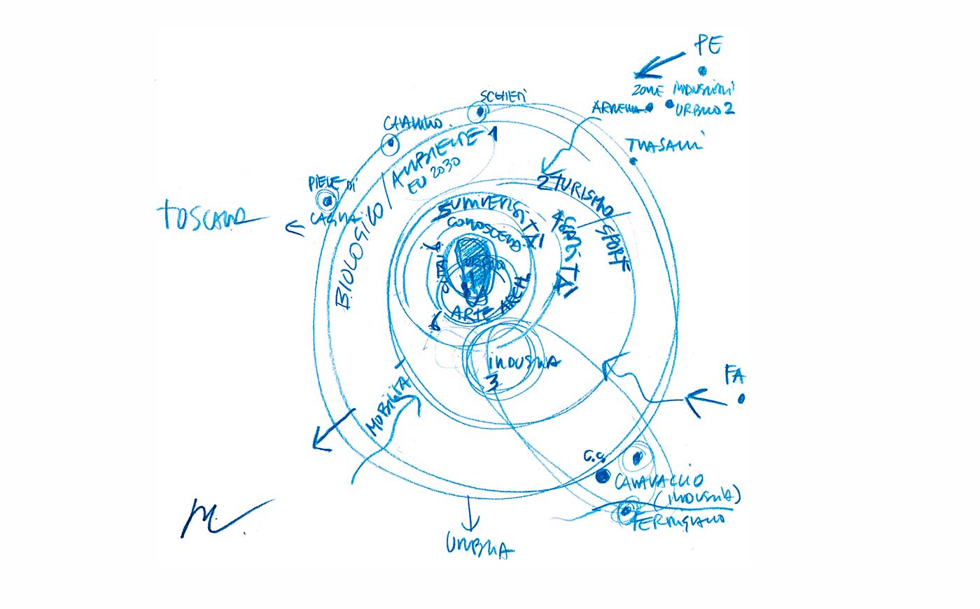 L’intento è quello di prendersi cura dell’intero territorio comunale, considerandolo come un sistema unitario ma articolato, leggibile attraverso una struttura di cerchi concentrici. Il centro simbolico e funzionale è la città storica dentro le mura, mentre il raggio massimo coincide con il sistema delle frazioni, del paesaggio agrario e naturale. Ogni cerchio affronta un tema specifico, ma nessuno è isolato: i cerchi dialogano tra loro e sono tenuti insieme da tematiche trasversali che attraversano tutto il territorio.