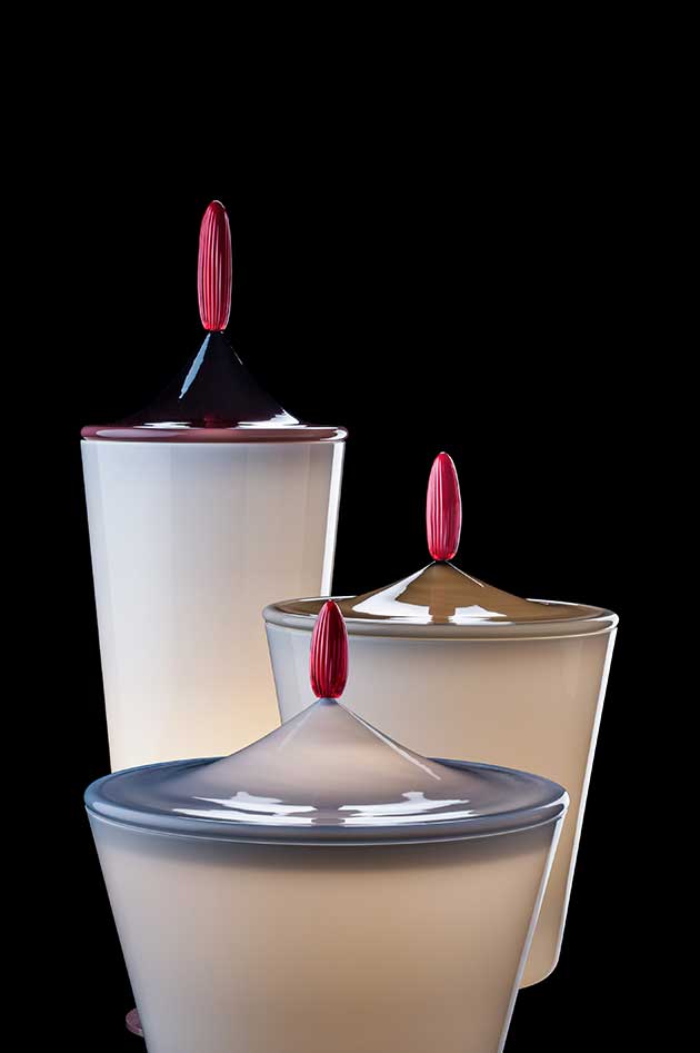La collezione è stata realizzata utilizzando il lattimo, un vetro bianco opaco nato a Murano a metà del XV secolo con l’intento di replicare le prime porcellane europee. La sovrapposizione di uno o più vetri sottili e trasparenti al vetro lattimo permette di ottenere oggetti dai colori intensi e accesi, in una convergenza tra dimensione artistica e pratica artigianale.