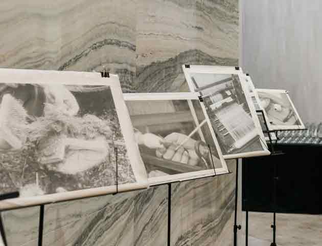 La mostra racconta la storia della tessitura Cangiari attraverso video e fotografie in bianco e nero, accompagnata da una selezione dei preziosi capi artigianali Cangiari