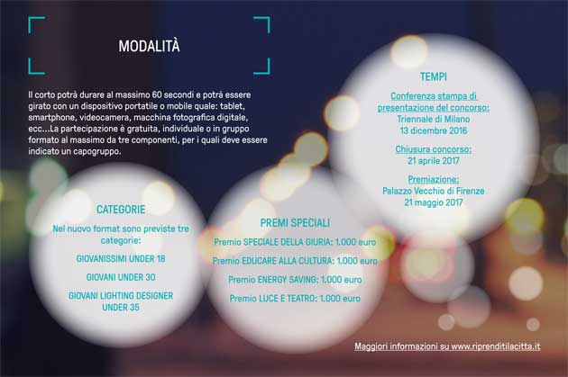 Nove i premi previsti, suddivisi in tre categorie: La luce e i giovani under 18; La luce e i giovani under 30; La luce e i lighting designer under 35.