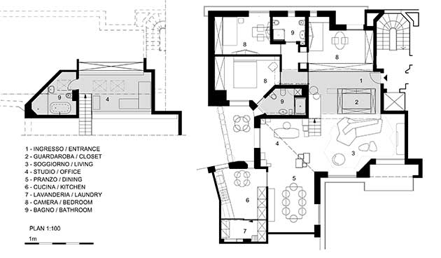 I proprietari desideravano conservare il comfort della loro precedente abitazione, più ampia, trovando nuova collocazione per i pezzi di arredo storici della famiglia in un ambiente luminoso. Il contrario di quanto offriva la pianta esistente, con numerosi piccoli locali e una scala chiusa che conduceva a un soppalco buio, negando le potenzialità di un ultimo piano circondato dal verde, con finestre sui quattro lati e tetto a falde inclinate con differenti pendenze.