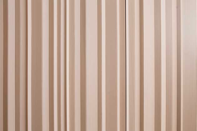 Dall’ingresso la vista corre fino alla camera padronale e al colore acceso della nicchia inserita nell’armadio. Sulla destra, il lungo contenitore (5 metri) che separa l’ingresso da una delle camere, in legno finito ad anilina bianca e ispirato alla trama dei tronchi d’albero in un bosco (sotto, dettaglio, foto ©Diana Lapin).