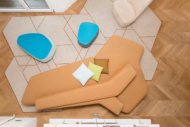 Dall’alto del soppalco si legge la sagoma a losanghe del tappeto in lana del soggiorno, realizzato da Kasthall su disegno di Bartoli Design, al centro del quale è collocato un divano multifacciale utilizzabile in varie direzioni. Sotto la scala in lamiera bianca, i pattern grafici dei tavolini Colour Wood in legno tinto di Karimoku fanno da contrappunto alla geometria della posa a spina ungherese del parquet di rovere.