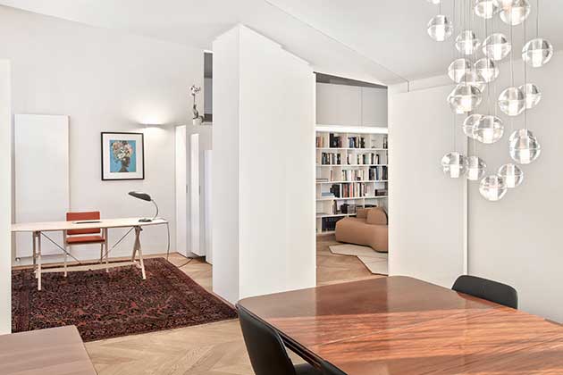 Molti divisori sono realizzati come elementi di arredo su disegno dei progettisti: nasce così il volume sotto il soppalco – che scherma il soggiorno dall’ingresso – con vani libreria che rivestono le quattro pareti del parallelepipedo, al cui interno è celato un guardaroba, accessibile dalla zona ingresso con lo scorrimento di mezza parete libreria.