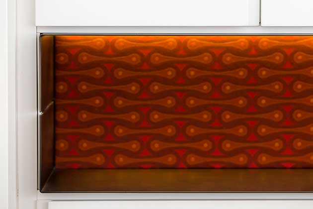 Per la camera padronale è stato progettato un armadio a tutta parete di profondità maggiorata, con nicchia in ottone brunito e schienale in tessuto arancio che riproduce un disegno del 1913 di Josef Hofmann e fa da fondale visivo fin dall’ingresso nell’appartamento. Un lungo piano corre alle spalle della testata in pelle del letto; sopra, i bracci di due applique bianche Turciù di Catellani&Smith fluttuano a parete, in contrasto con le linee rigorose degli altri arredi.