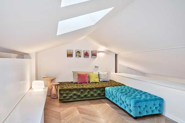 Aperto in continuità visiva sul living e illuminato da lucernari, il soppalco è un ambiente aperto, arredato con le iconiche sedute Michetta in velluto di Gaetano Pesce, che occasionalmente diventa camera per gli ospiti grazie a teli oscuranti scorrevoli, e comprende un bagno, piccolo ma completo, realizzato con materiali e finiture che fanno pensare a una nevicata.