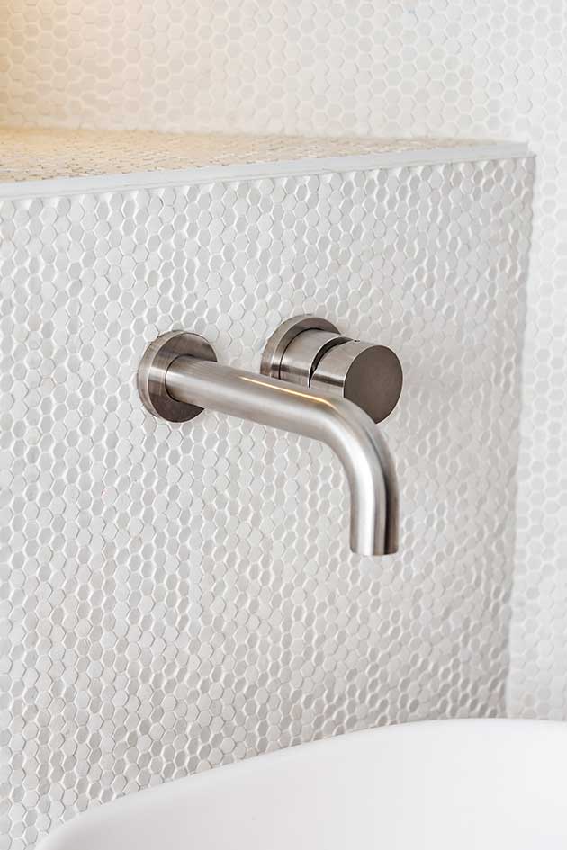 Il bianco domina, in una palette di sfumature e trattamenti sofisticati: le pareti sono finite con pittura all’argilla, che dà profondità e trasparenza; le laccature degli elementi di arredo sono spazzolate a mano, così che quando ci si avvicina si legge la luce rifessa in sottili filamenti; l’essenza della parete contenitore all’ingresso è finita con anilina bianca, che permette di leggere la texture del legno.