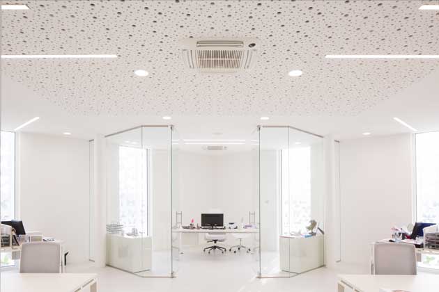 Per le scrivanie e i tavoli da lavoro sono stati selezionati apparecchi lineari con un design elegante e una distribuzione della luce morbida e omogenea, ideale per il comfort visivo e per l’utilizzo con videoterminali; nelle aree adiacenti e di passaggio completa l’illuminazione il downlight Lunis.