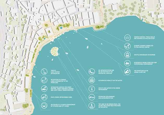 «La visione urbana di CRA di trasformare la frattura del lungolago in uno spazio reattivo e dinamico – ha spiegato Federico Parolotto, senior partner di Mic-Mobility-in-chain – è stata supportata da dati e modelli scientifici sulla mobilità locale. Da qui sono nate soluzioni di micro-mobilità, integrate alla mobilità privata, fatte di veicoli elettrici autonomi, segnaletica intelligente, arredo urbano reattivo, infrastrutture che producono energia pulita dall’assorbimento del calore e di nodi di mobilità grazie ai quali le persone possono selezionare il loro modo di trasporto preferito e condiviso».