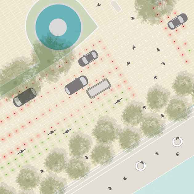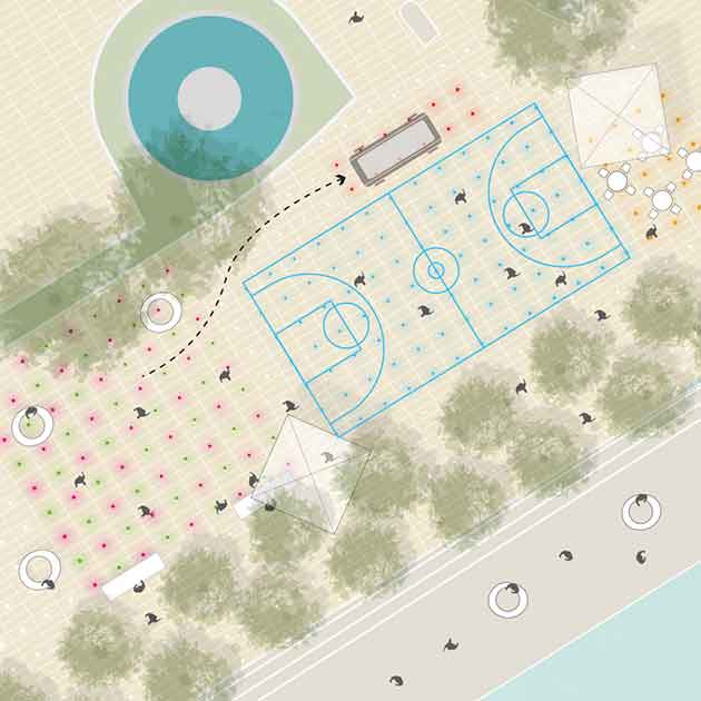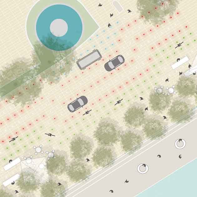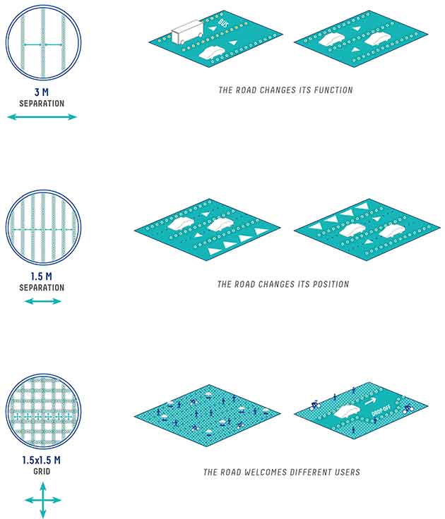Nell’idea di Carlo Ratti – che ha lavorato con Mobility-in Chain per lo studio della mobilità e con Italo Rota per la consulenza artistica e che sfrutta le ricerche del Senseable City Lab del Mit sulla guida autonoma e sui modelli di mobilità condivisa– l’attuale carreggiata stradale potrà disporre, nei differenti momenti della giornata e secondo le esigenze, di una o due corsie o venire chiusa al traffico trasformandosi, all’occorrenza, in un campo di gioco o uno spazio di socialità.