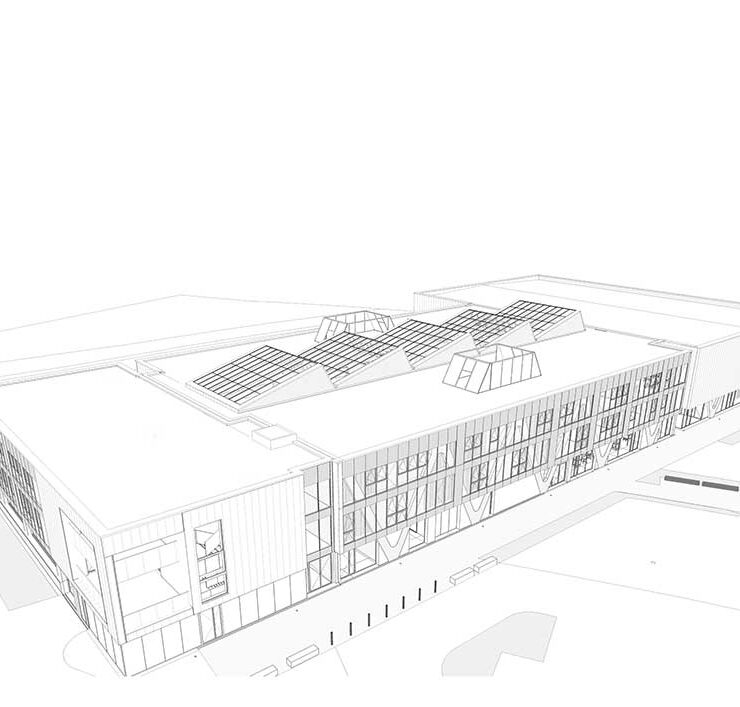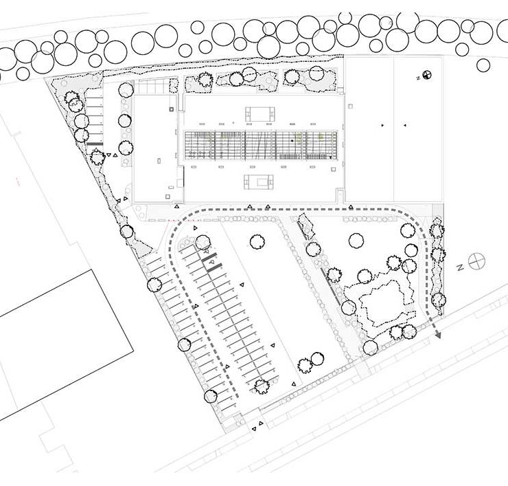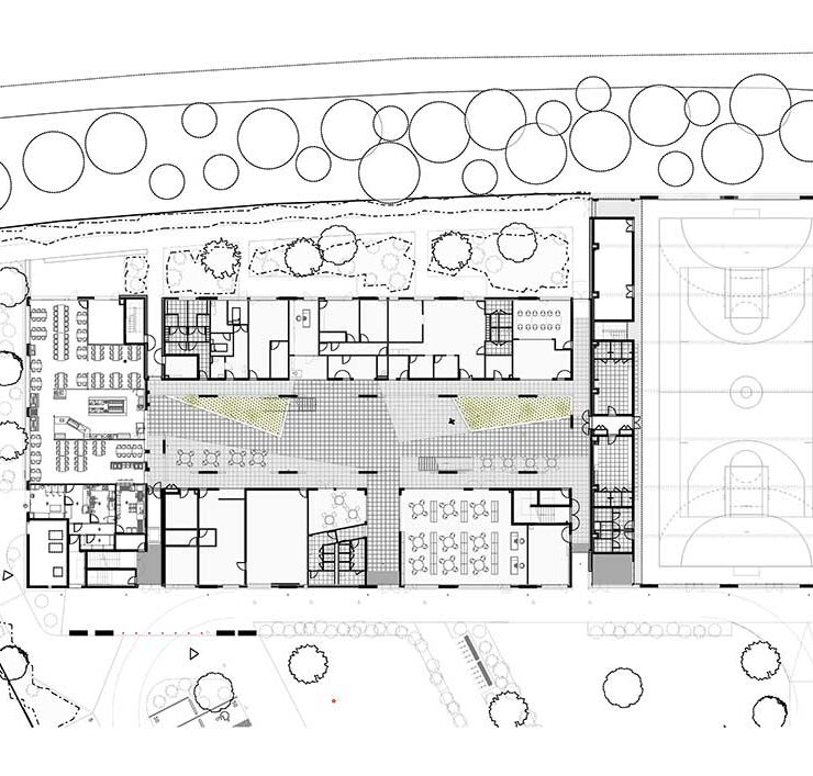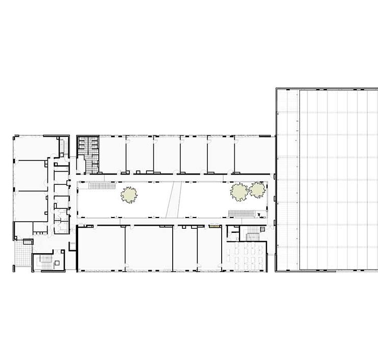 La palestra, uno spazio dedicato non solo al complesso scolastico ma anche alla città, ospita al primo piano un’area polisportiva per attività come pallacanestro, pallamano, pallavolo e, al piano superiore, una sala pesi e una parete di arrampicata. Anche questa architettura prosegue il motivo strutturale a forma di W, che permette di sospendere il volume costruito e di liberare una totale trasparenza del campo sportivo verso l’esterno.