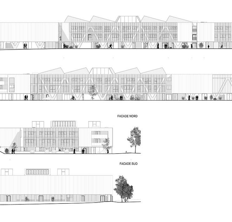Queste tre entità, distribuite su due piani, formano un unico edificio che gravita attorno a un atrio coperto da un tetto di vetro. Questo spazio centrale è un riferimento all’atrio vetrato dell’altro importante complesso scolastico cittadino, denominato Intra Muros, autentico luogo di incontro della comunità di Saint-Malo.